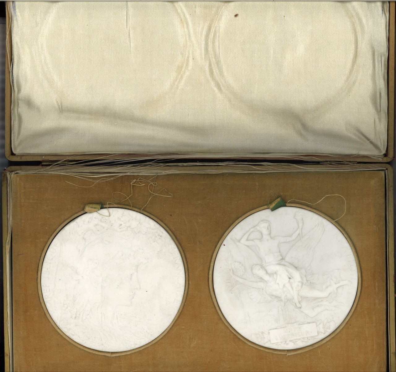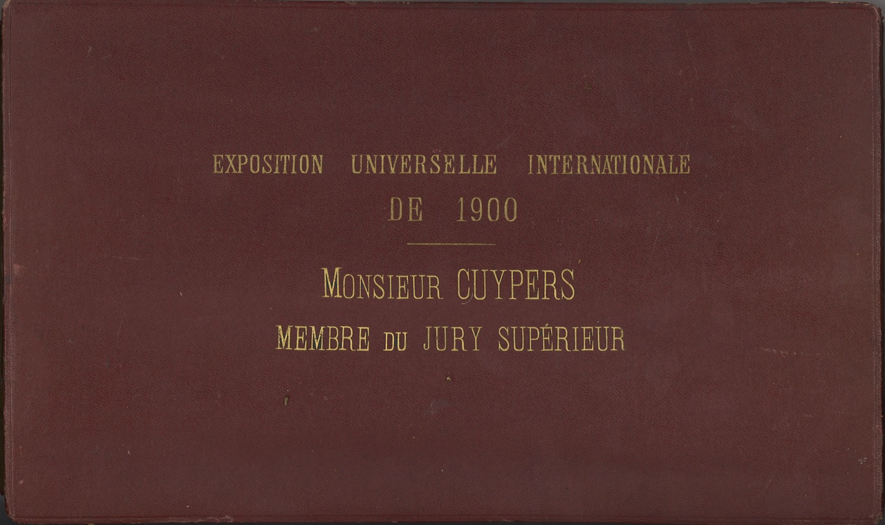 In rode doos waarop tekst in goud Exposition Universelle Internationale de 1900. Monsieur Cuypers, Membre du Jury Superieur: 2 witte ronde plaquettes met voorstelling gezicht (met randtekst: Republique Française) en twee figuren (met onderschrift: Jury Superieur) in reliëf.