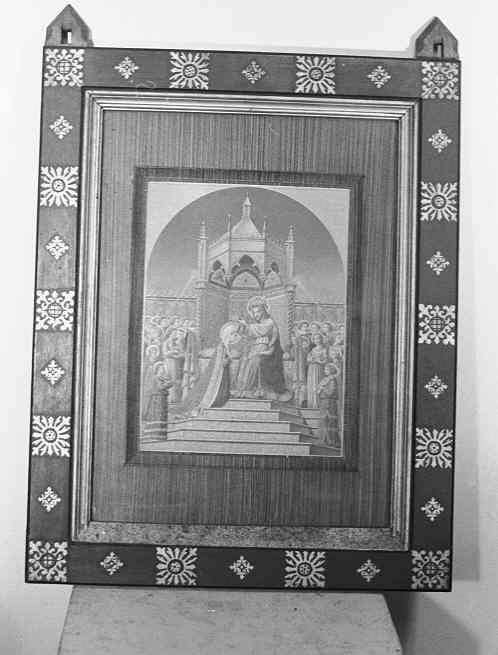 Afbeelding van geknielde Maria die van Jezus een kroon op haar hoofd krijgt. Beiden op een trap, onder een baldakijn. Rondom engelen met muziekinstrumenten. In houten met roodbruin en goud beschilderde lijst. Op hoeken r.b. en l.b. een driehoekige punt met een gat om aan op te hangen.