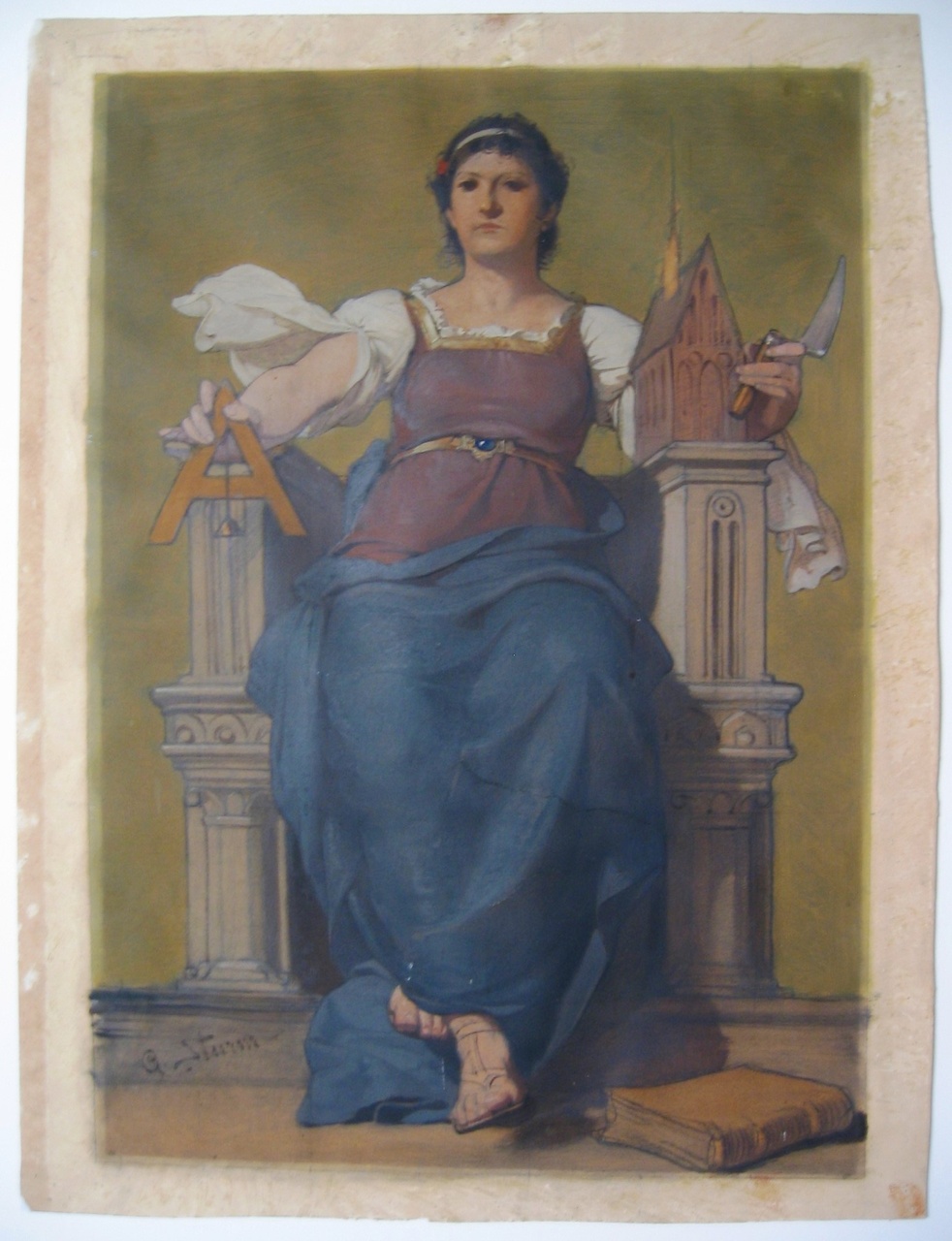 Een jonge vrouw zit op een stenen bank. Op de rechter leuning staat een kerkje met neogotische spits. Zij draagt een wit lint in het haar met een rode sluiting. Verder draagt ze een blouse met wijde witte mouwen, een roodbruine jurk met daar gedeeltelijk overheen een blauwgrijze omslag. Aan haar voeten ligt een dik boek. Rechts heeft ze een ytroffel in haar hand en links een schietlood en een houten letter A (=meetlineaal?).