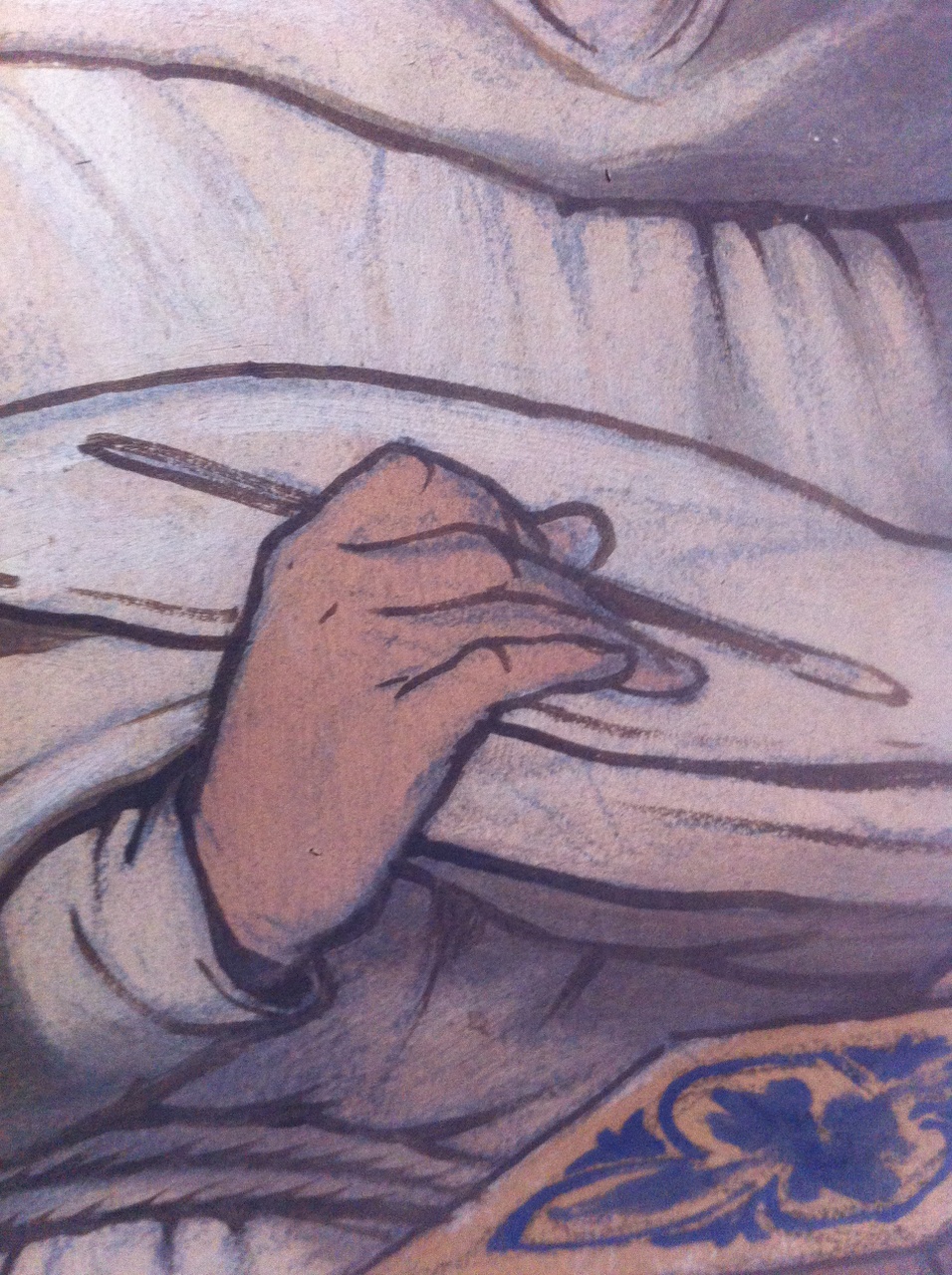 Een monnik in lange witte pij houdt in zijn ene hand een penseel en in zijn andere een reeds beschilderd tablet vast.
