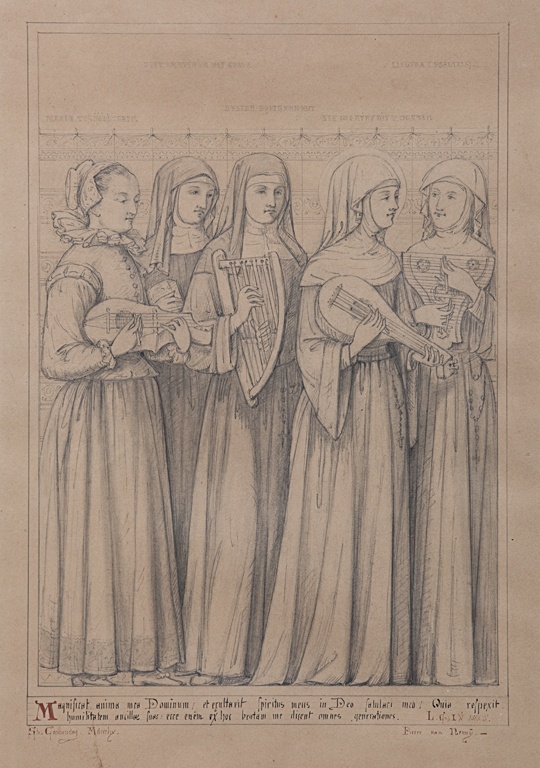 De tekening is een ontwerp voor de beschildering van de piano die Pierre Cuypers schenkt aan Antoinette Alberdingk Thijm bij gelegenheid van hun huwelijk in 1859. Vijf musicerende vrouwen zijn afgebeeld: twee Delftse nonnen uit de veertiende eeuw (Lieltra en Gertrudis van Oosten), Berthken, dichteres Susana Wes, het begijntje van Grave en Maria Tesselschade Roemer Visser. Deze vrouwen waren belangrijk in de geschiedenis van gewijde muziek en waren een inspiratiebron voor de ontvangster van het huwelijksgeschenk, de muzikale Antoinette Alberdingk-Thijm. Het onderschrift luidt: "Pierre aan Nenny".
