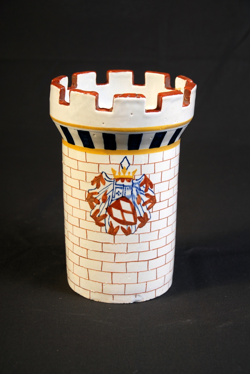 Met 6 losse bakjes, 6 torens met deksel, 1 grote toren. Gedecoreerd met wapen van kasteel De Haar (wapen met ruit en met zuiltjes) en vissen in de gracht.