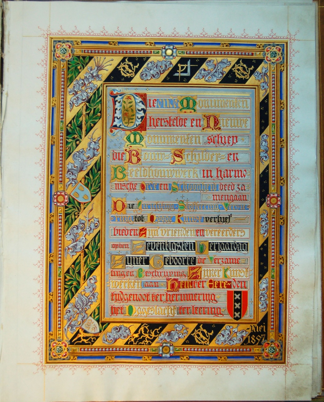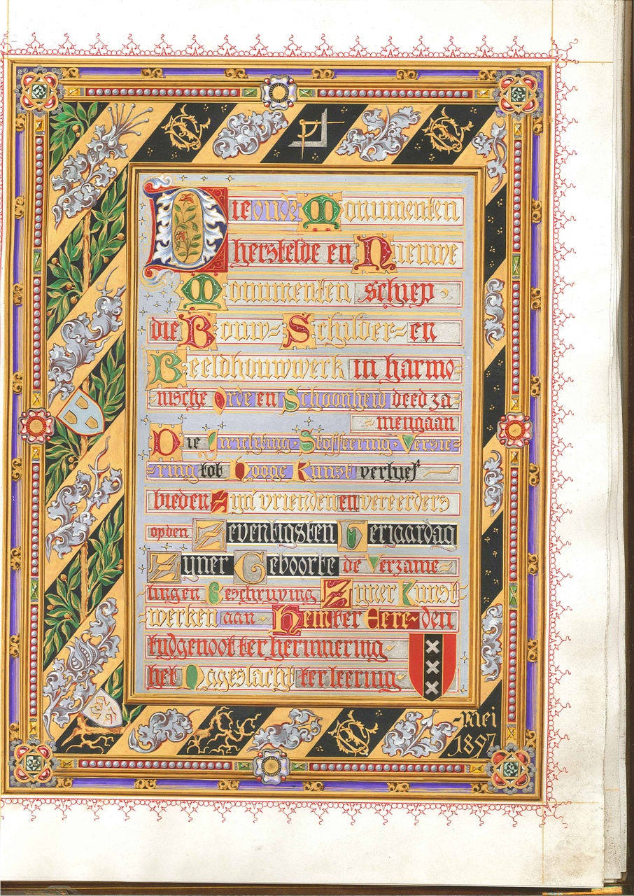 Afbeelding 0372-2 vervolgt met de tekst: "die oude Monumenten schiep, die Bouw-, Schilder- en Beeldhouwwerk in harmonieuze Orde en Schoonheid deed zamengaan. Die Inrichting, Stoffeering, Versiering tot hooge Kunst verhief, bieden zijn Vrienden en Vereerders op den zeventigsten Verjaardag zijner Geboorte de Verzameling en Beschrijving zijner Kunstwerken aan. Hem ter Eere den Tijdgenoot ter Herinnering en het Nageslacht ter Leering."
