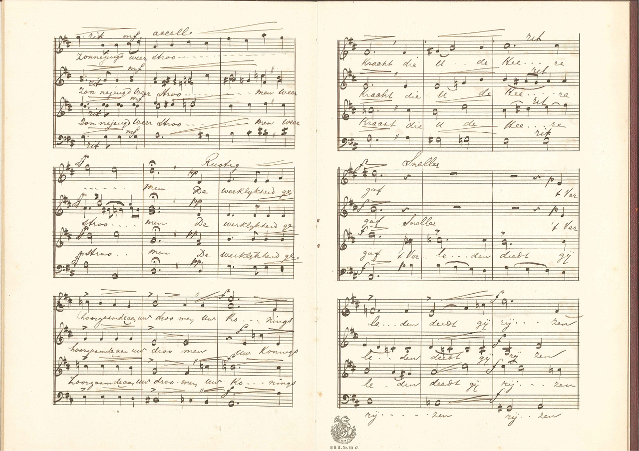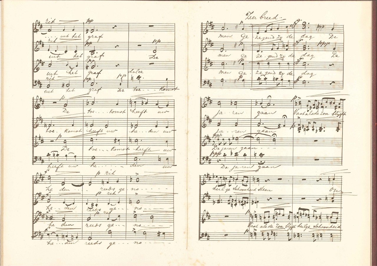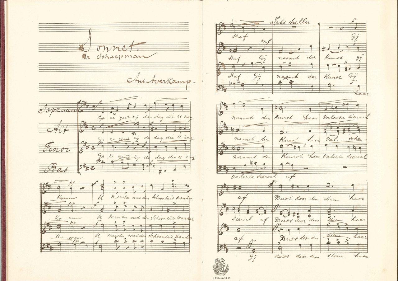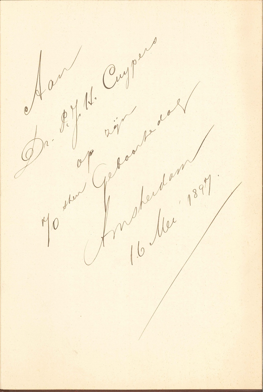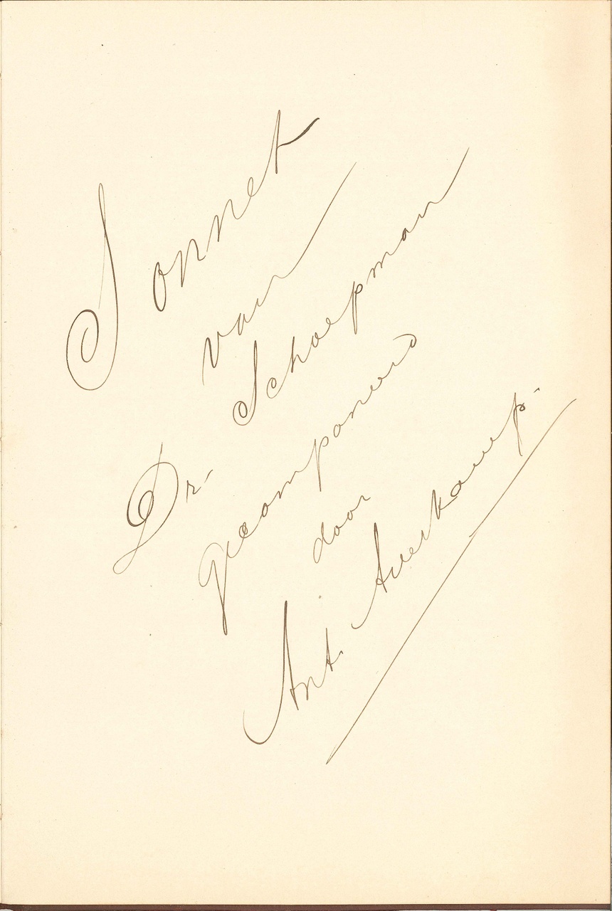 Tekst op eerst pagina: Aan Dr. P.J.H. Cuypers op den 70sten Geboortedag Amsterdam 16 Mei 1897 Op tweede pagina: Sonnet van Dr. Schaepman, gecomponeerd door Ant. Averkamp. In rood leren band. Notenbalken voorgedrukt, muziek erin geschreven.