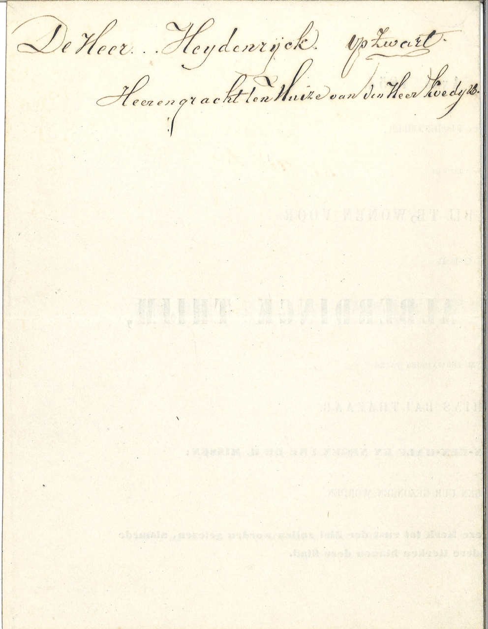 0386g: Uitnodiging voor de begrafenis van de Heer Lambertus Joannes Alberdingk Thijm in de kerk pater Mattias Balthazaar op 14 decemberl 1854. Op de buitenzijde de naam van de geadresseerde: De Heer Heydenrijck vd Zwart Heerengracht ten huize van de Heer Lievedijk (?).