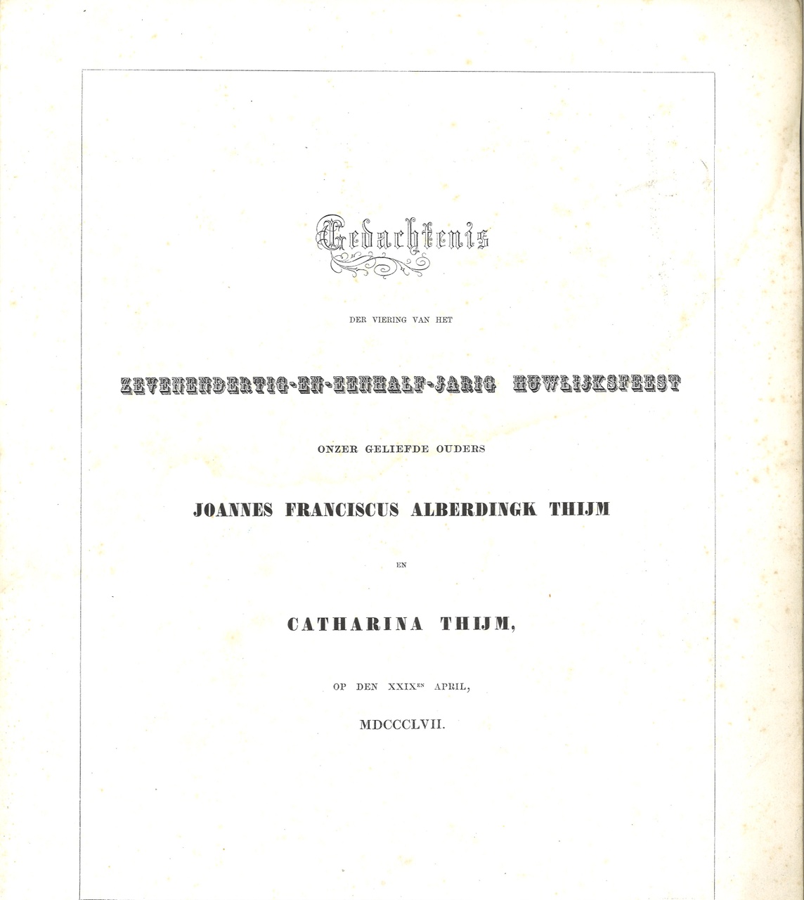 Mapje met persoonlijke herinneringen van de familie Alberdingk Thijm: "Herdenkingsboekje voor het 37,5 jarig huwelijks feest op 29 april 1857 van Joannes Franciscus Alberdingk Thijm met Catherina Thijm. ".