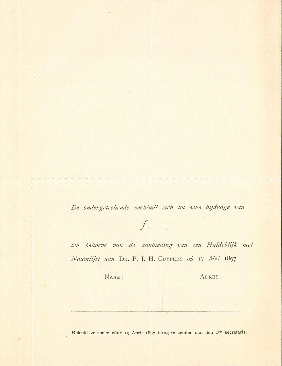 Vertrouwelijke brief aan de leden van genootschap 'Archtitectura et Amicitia' april 1897, namens het bestuur i.v.m. huldeblijk aan Cuypers, met inschrijvingsbiljet. Dubbelgevouwen.