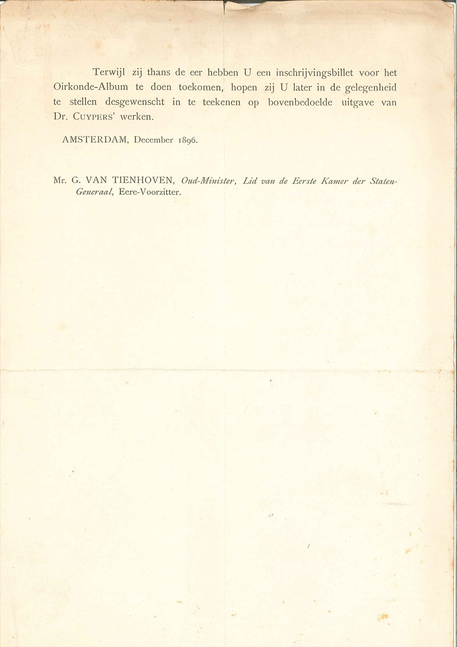 Brief van Mr. G. van Tienhoven (Oud minister, lid van de Eerste kamer en Eere voorzitter) december 1896, i.v.m. aanbieding oirkonde-album. Zat inschrijvingsbiljet aan, is eraf.