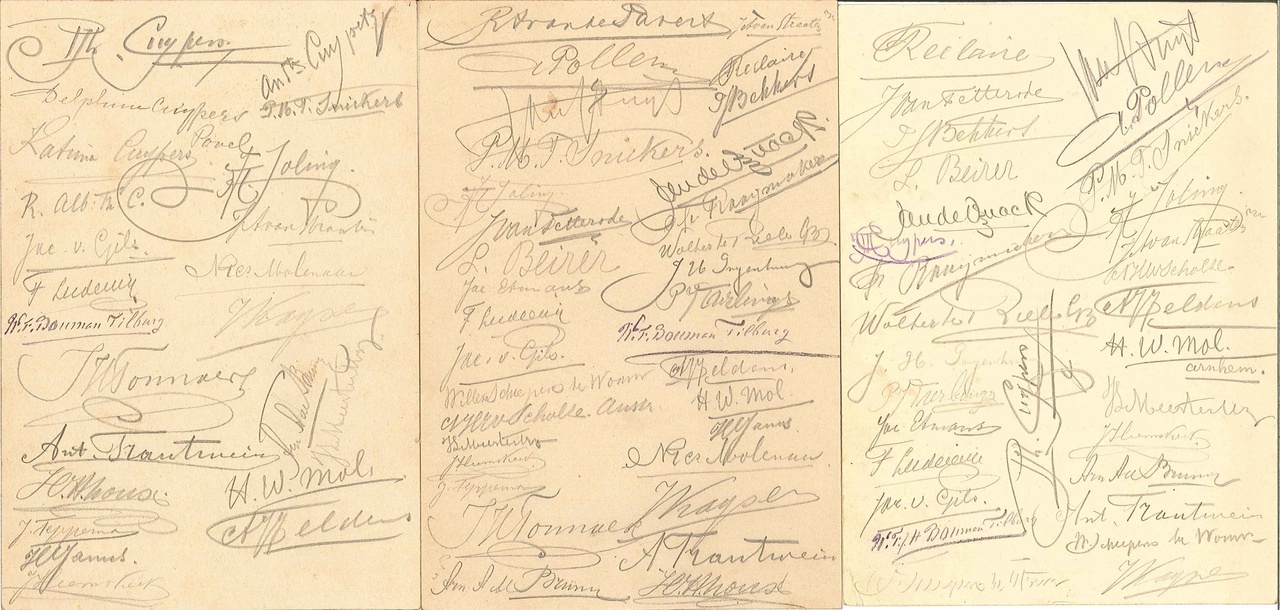 Spijskaart Hôtel de l'Europe, 16 mei 1897. 1 op naam van de Hr. Jos Cuypers-Povel en 1 op naam van Dr. P.J.H. Cuypers-Alberdink Thijm. Op achterkant staan handtekeningen van de gasten, in potlood. Met decoratieve rand: man met boog en hond, ranken en bladeren.