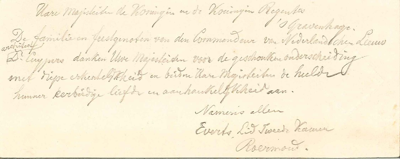 Menukaart, 20 mei 1897. Achterop staat in potlood een klad-bericht aan de koningin en de koningin regentes, geschreven door Everts, lid Tweede Kamer Roermond, namens de familie en feestgenoten van architect Dr. Cuypers, als dank voor de aan Cuypers geschonken onderscheiding.