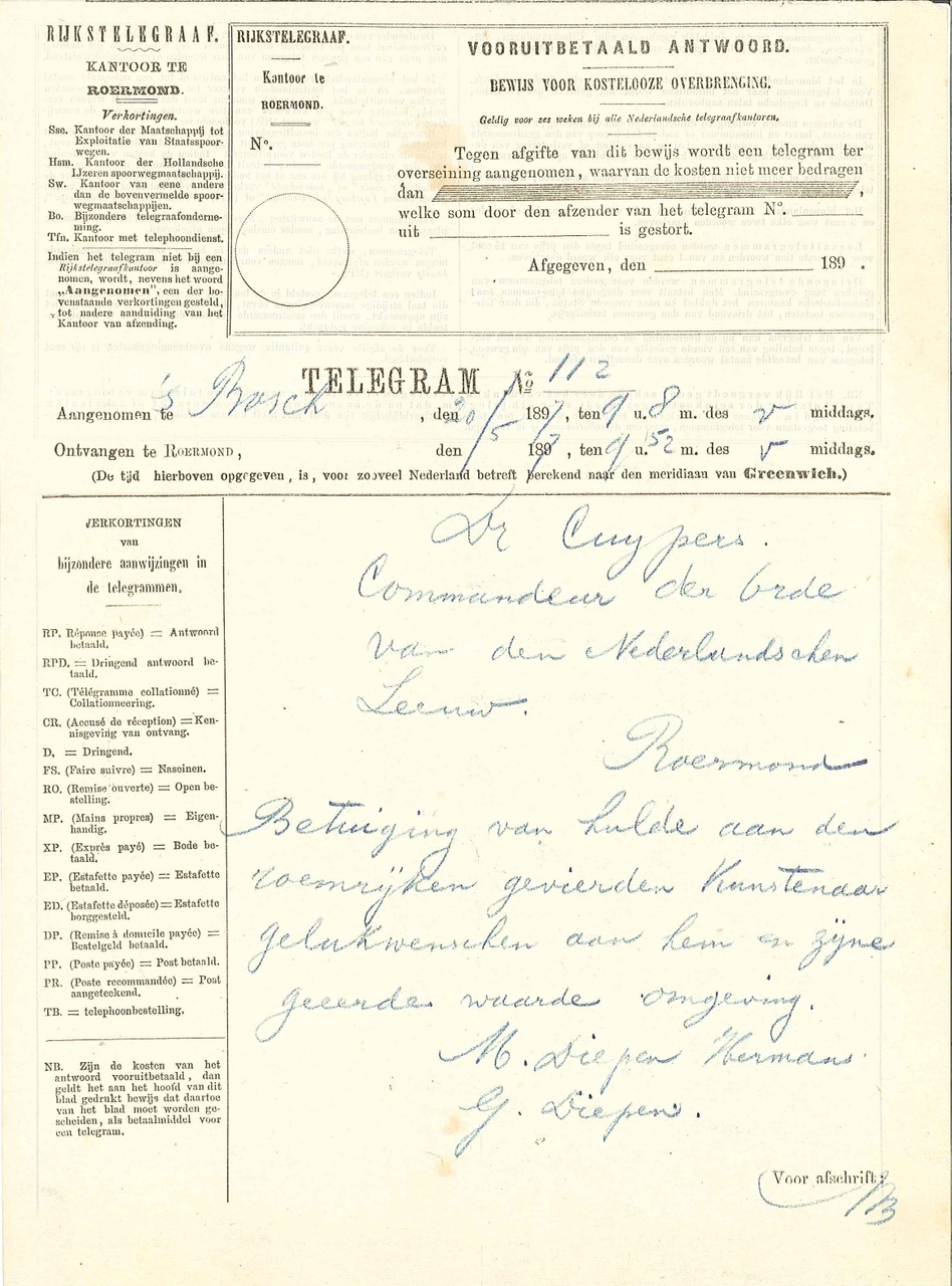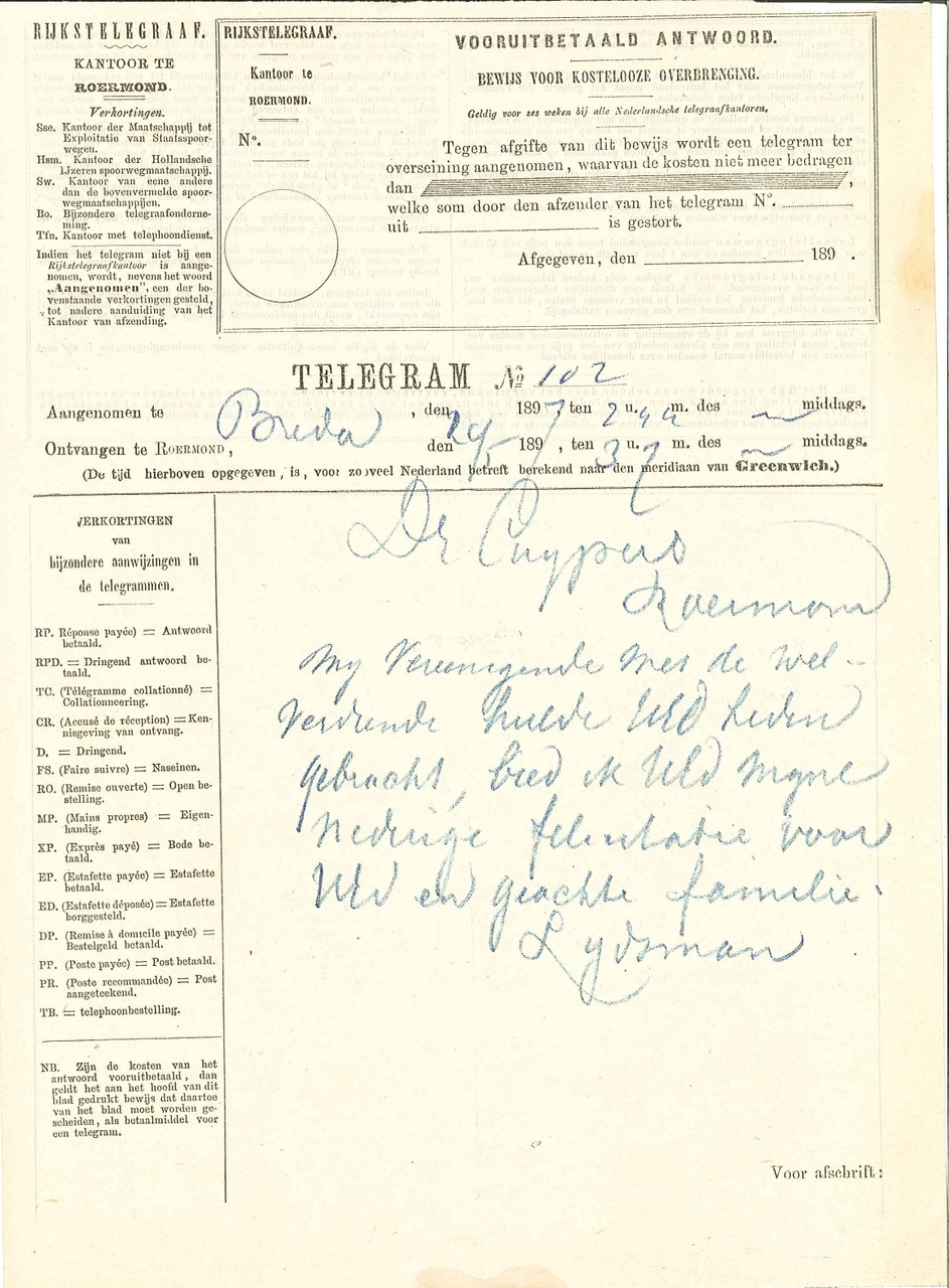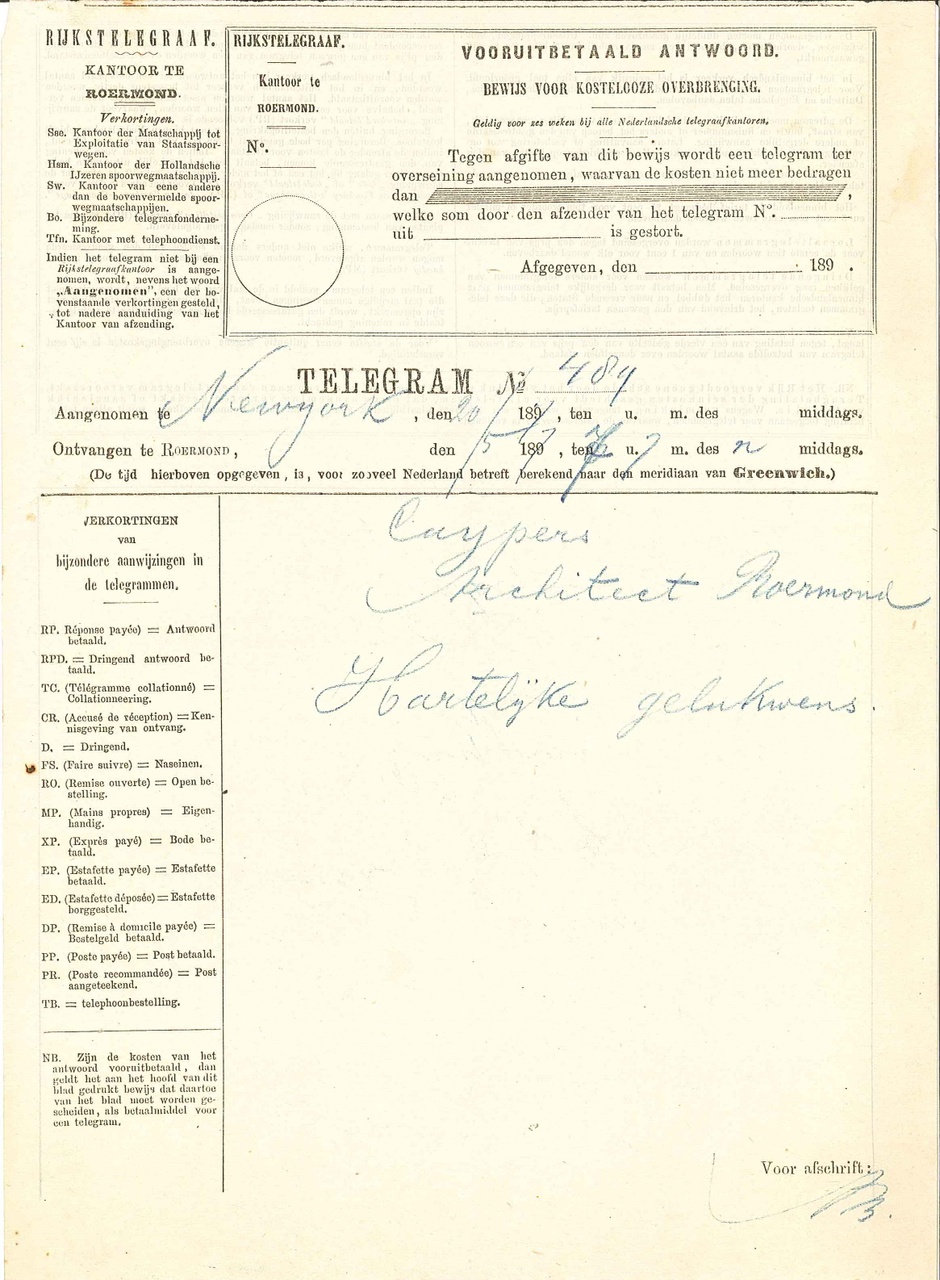 23 telegrammen, mei 1897, aan P.J.H. Cuypers. telegrammen van: -Kety en Frans Coenen, Weert