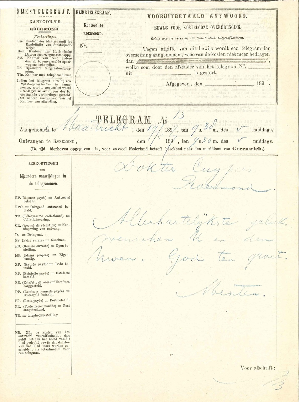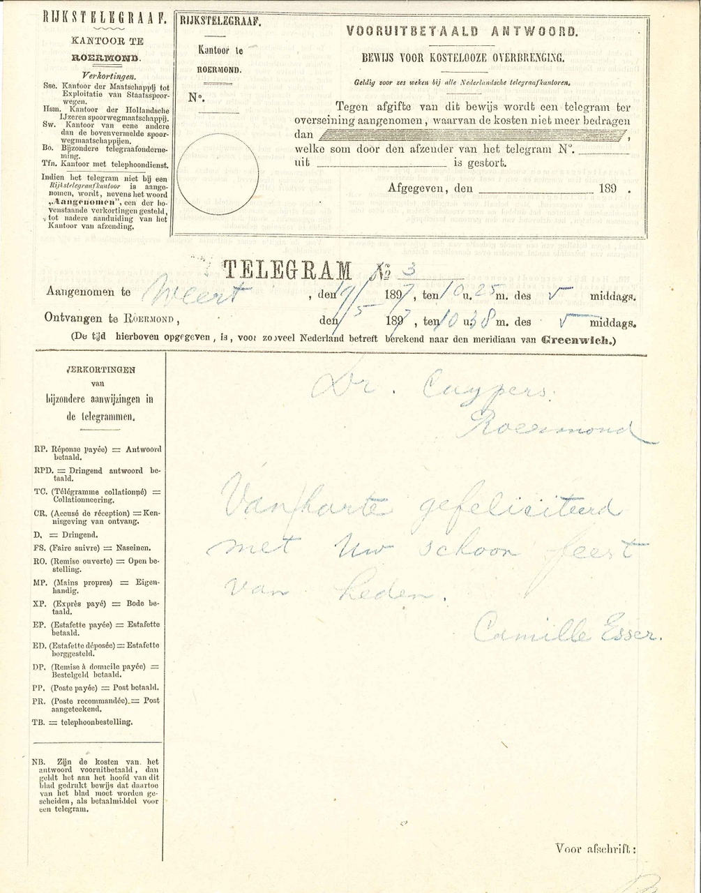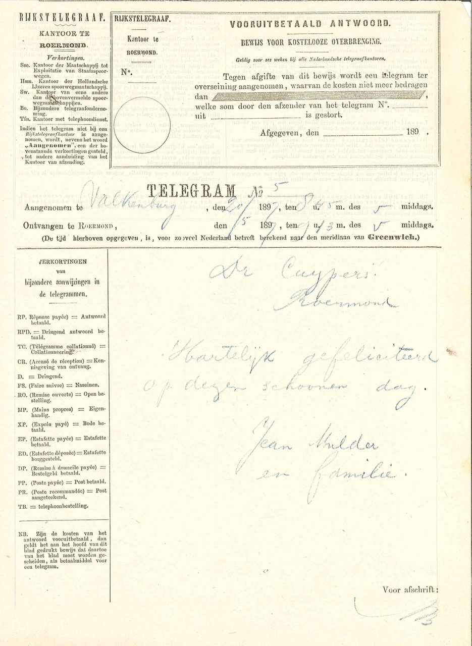 23 telegrammen, mei 1897, aan P.J.H. Cuypers. telegrammen van: -Kety en Frans Coenen, Weert