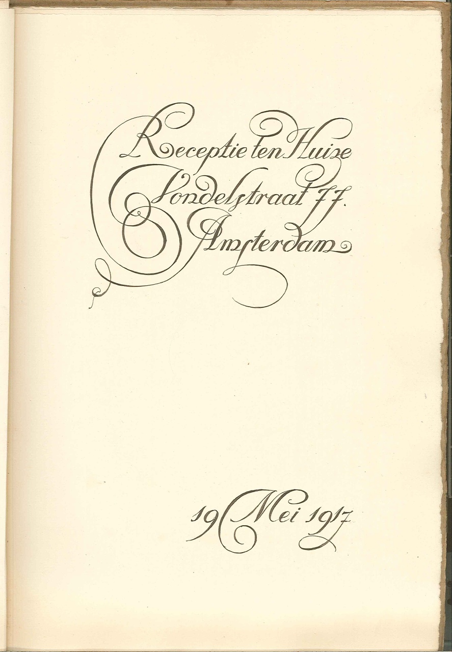 Op 1e bladzijde: Receptie ten Huize Vondelstraat 77 Amsterdam, 19 mei 1917. Op voorkant: Dr. P.J.H. Cuypers, Architect, 16 mei 1827 Roermond 1917. Gedecoreerd met o.a. wapen van Roermond en Amsterdam, familiewapen. Voorzien van diverse handtekeningen. Gebonden met koord.