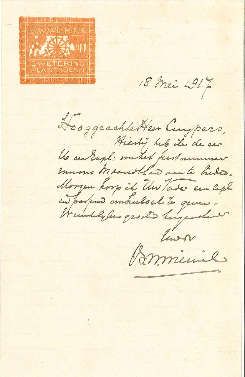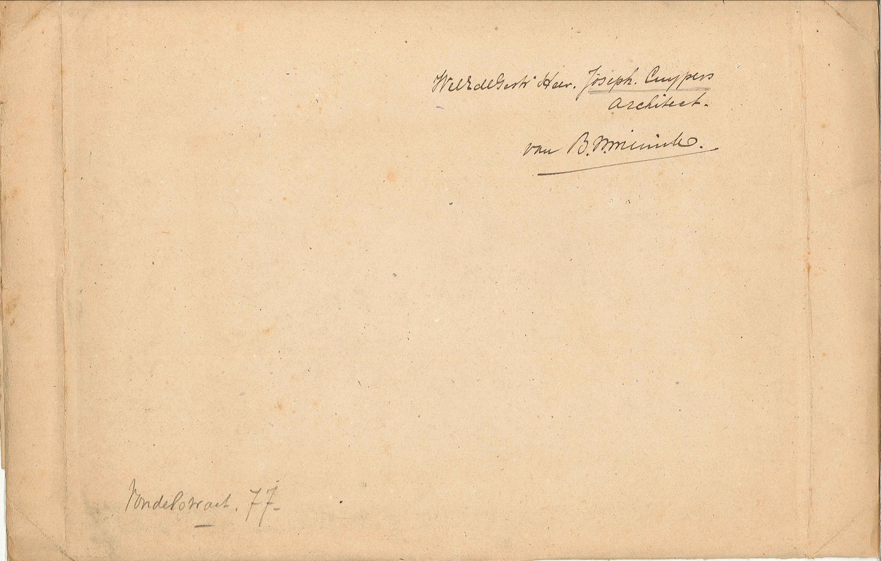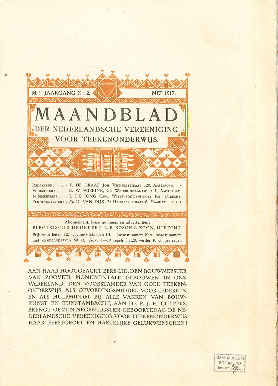 Uitgave t.g.v. de 90e verjaardag van Dr. P.J.H. Cuypers.Proefdruk van de 34e jaargang no. 2, mei 1917, aangeboden door de voorzit- ter van de vereeniging aan Joseph Cuypers. Briefje d.d. 18 mei 1917 zit er bij, tevens karton met afbeelding van Cuypers: Ons Eerelid. In papieren omslag waarin het des- tijds verzonden is: J.Cuypers, Vondelstr. 77