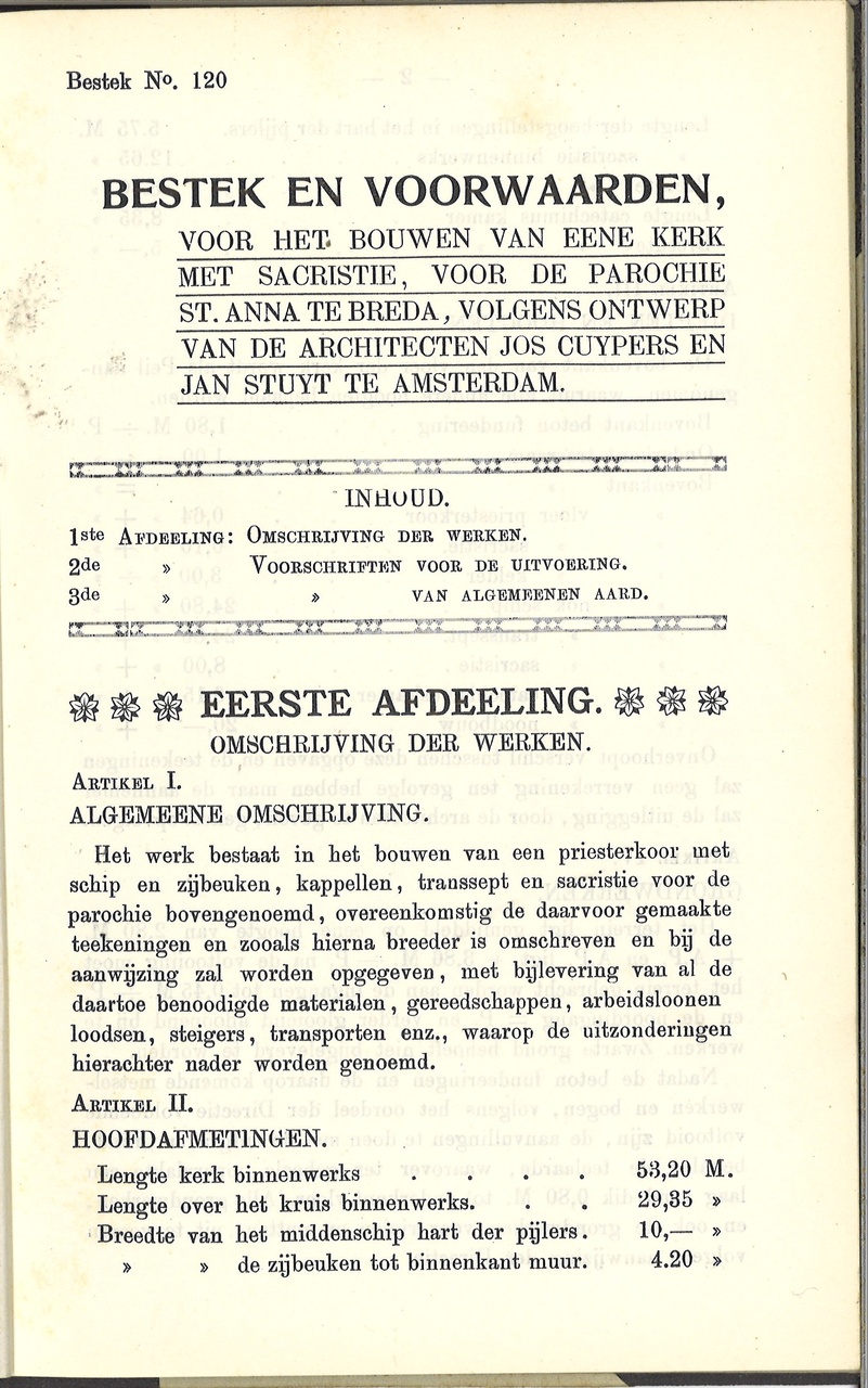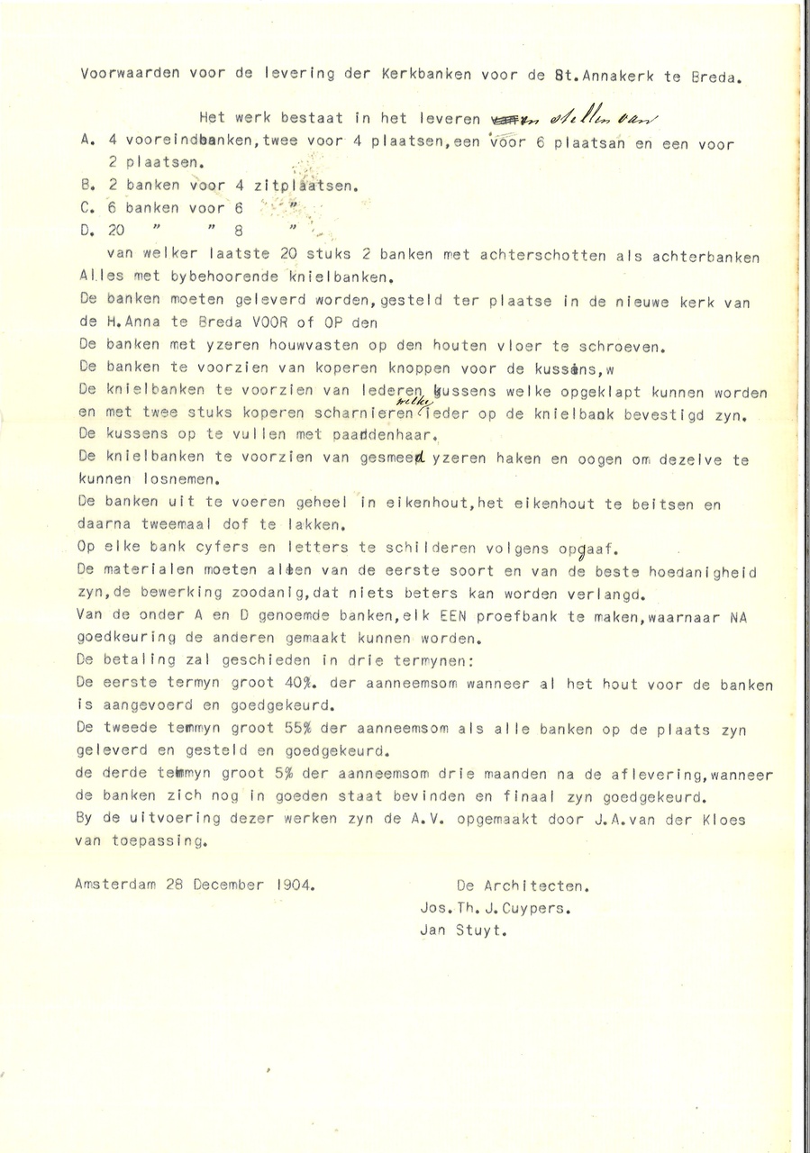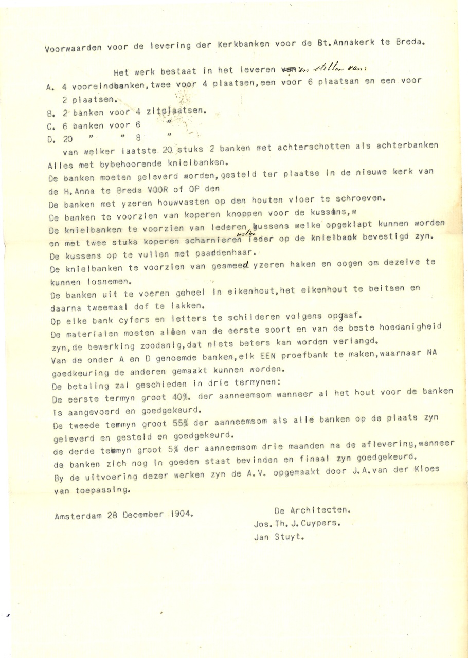 Bestek en voorwaarden voor het bouwen van eene kerk met sacristie, voor de parochie St. Anna te Breda, volgens ontwerp van de architecten Jos Cuypers en Jan Stuyt te Amsterdam. Met aantekeningen en erbij ingestoken aanwijzingen, kranteknipsels e.d. juni 1903, 2 exemplaren aanwezig.