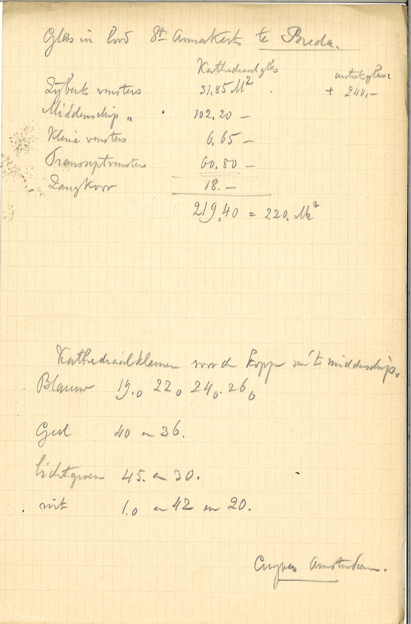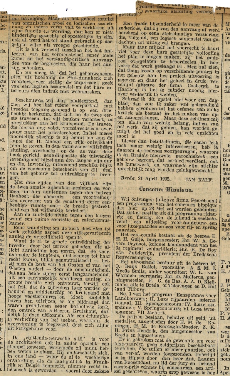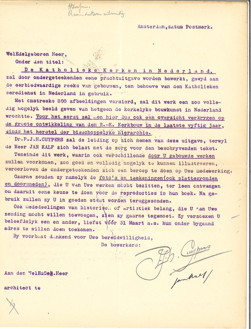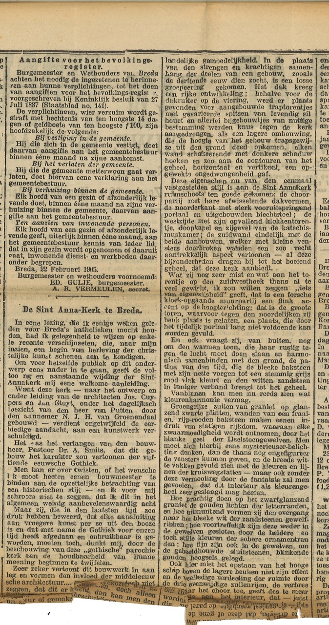 Bestek en voorwaarden voor het bouwen van eene kerk met sacristie, voor de parochie St. Anna te Breda, volgens ontwerp van de architecten Jos Cuypers en Jan Stuyt te Amsterdam. Met aantekeningen en erbij ingestoken aanwijzingen, kranteknipsels e.d. juni 1903, 2 exemplaren aanwezig.