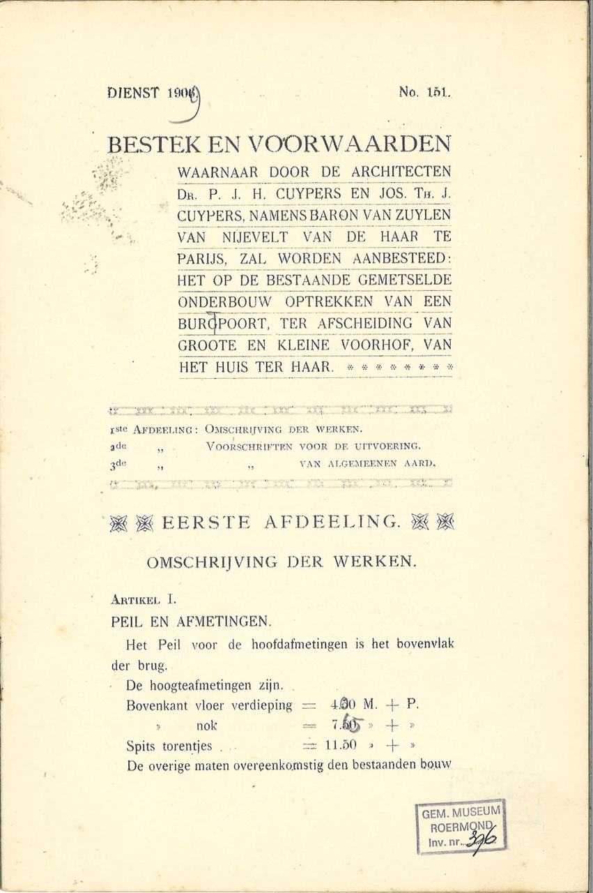 Bestek en voorwaarden waarnaar door de architecten Dr. P.J.H. Cuypers en Jos Th.J. Cuypers, namens Baron van Zuylen van Nijevelt van de Haar te Parijs, zal worden aanbesteed: het op de bestaande gemetselde onderbouw optrekken van een burgpoort, ter afscheiding van groote en kleine voorhof, van het Huis ter Haar.