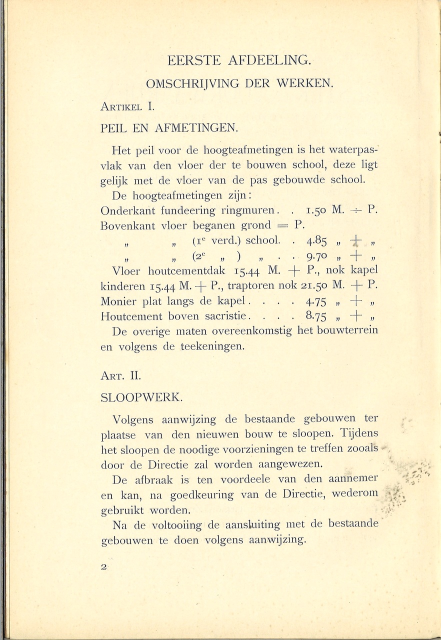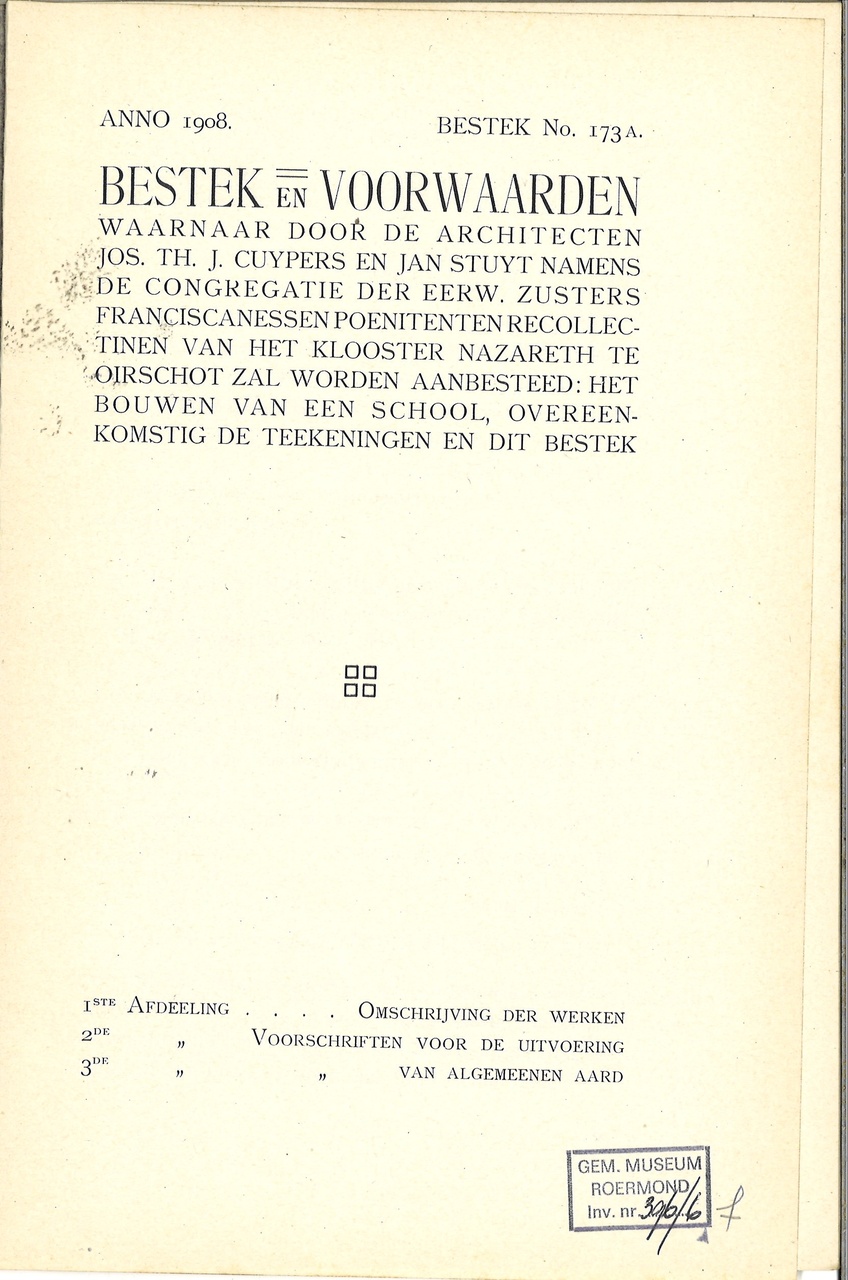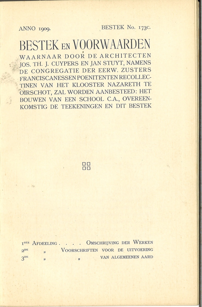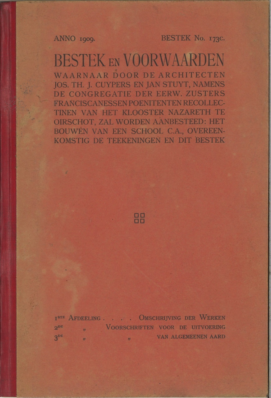 Bestek en voorwaarden waarnaar door de architecten Jos. Th.J. Cuypers en Jan Stuyt namens de congregatie der eerw. zusters Pranciscanessen Poenitenten Recollectinen van het Klooster Nazareth te Oirschot zal worden aanbesteed: het bouwen van een school. Anno 1908,