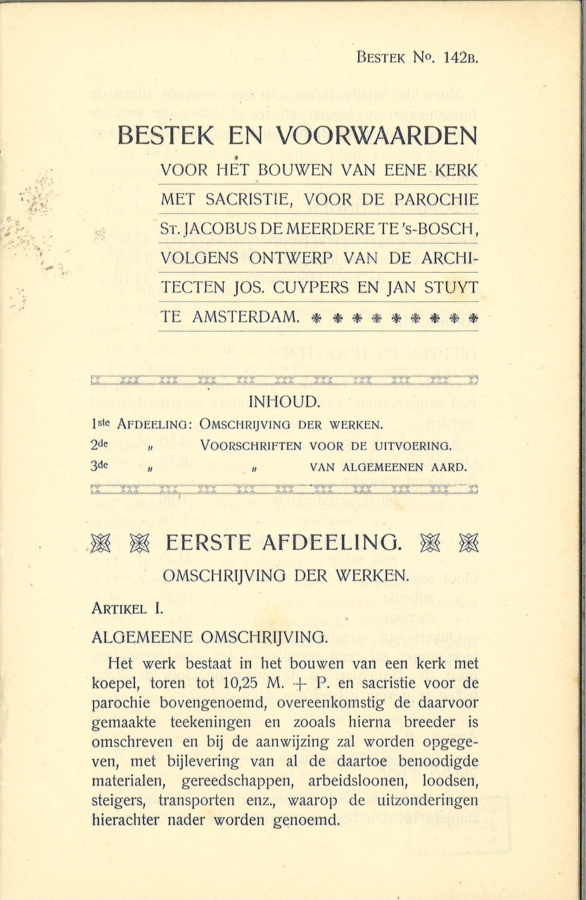 Bestek en voorwaarden voor het bouwen van eene kerk met sacristie, voor de parochie St. Jacobus de Meerdere te 's-Bosch, volgens ontwerp van de architecten Jos. Cuypers en Jan Stuyt te Amsterdam. Juni 1905, bestek no. 142 b Grijze kaft.