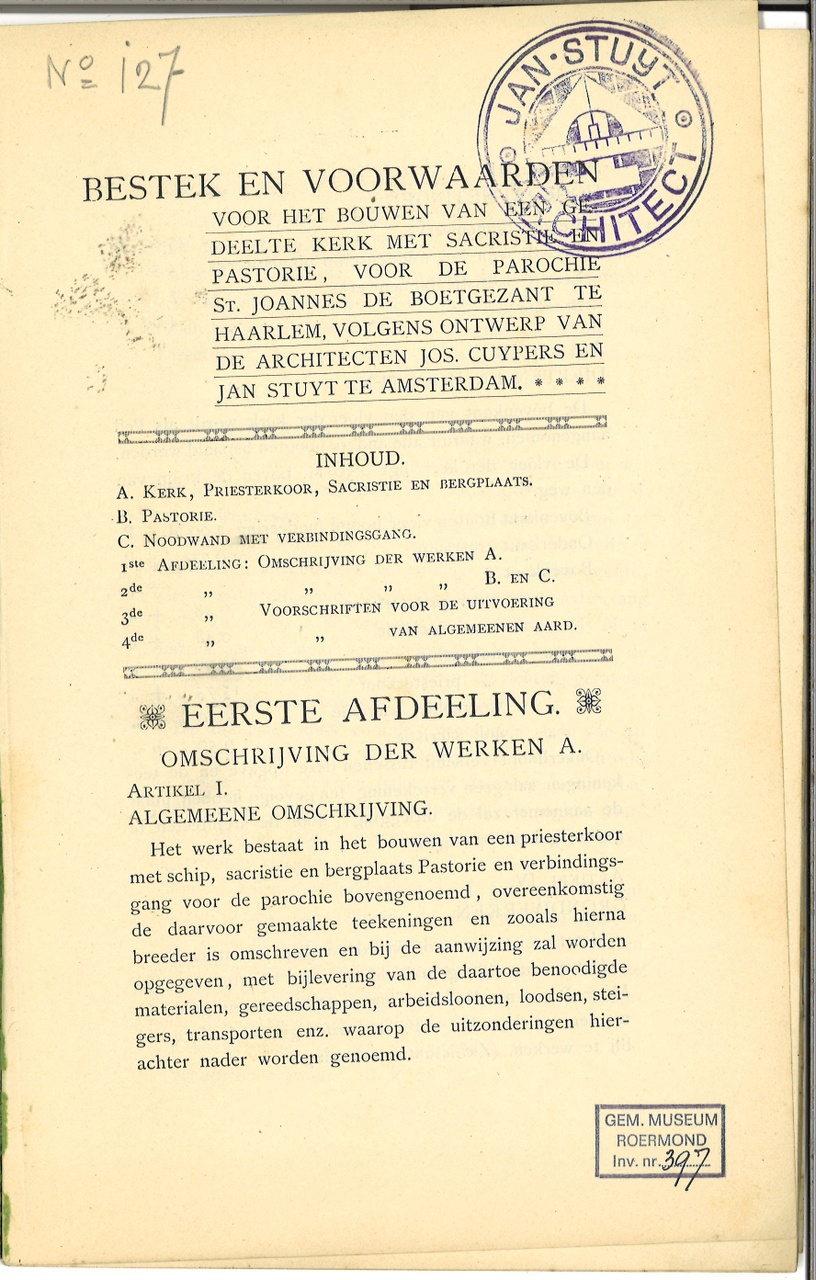 Bestek en voorwaarden voor het bouwen van een gedeelte kerk met sacristie en pastorie, voor de parochie St.Joannes de Boetgezant te Haarlem, volgens ontwerp van de architecten Jos. Cuypers en Jan Stuyt te Amsterdam. Bestek nr. 127. Met toevoegingen en aanpassingen. Groene kaft. 43 pag.