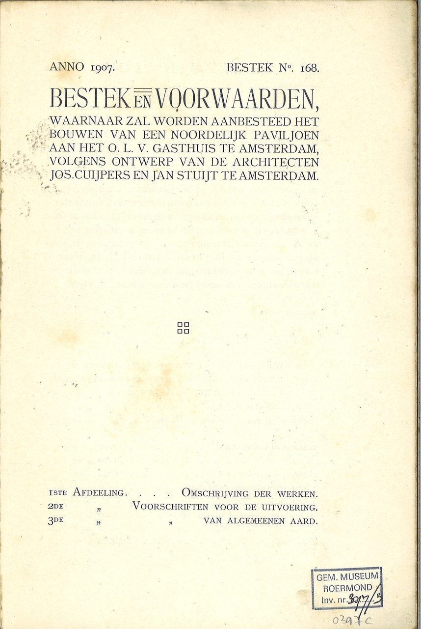Bestek en voorwaarden, waarnaar zal worden aanbesteed het bouwen van een noordelijk paviljoen aan het O.L.V. Gasthuis te Amsterdam, volgens ontwerp van de architecten Jos.Cuypers en Jan Stuyt te Amsterdam. Bestek nr. 168. Grijze kaft. 29 pag.