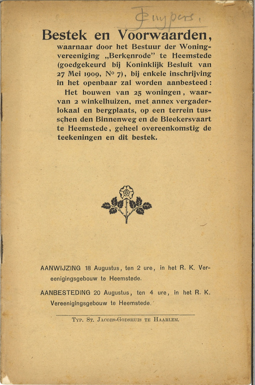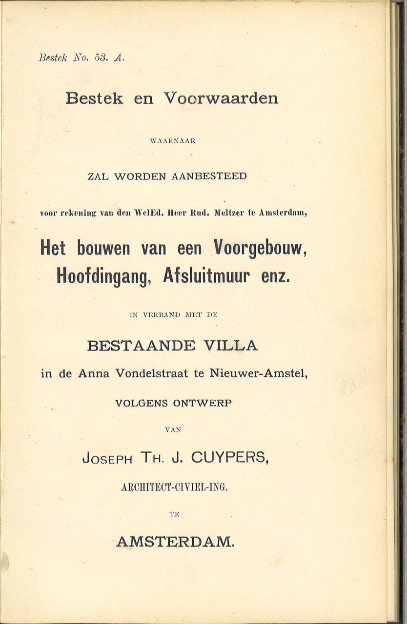 Bestek en Voorwaarden waarnaar zal worden aanbesteed voor rekening van den Weled. heer Rud.Meltzer te Amsterdam, Het bouwen van een Voorgebouw, Hoofdingang, Afsluitmuur enz. in verband met de bestaande villa in de Anna Vondelstraat te Nieuwer-Amstel, volgens ontwerp van Joseph Th.J. Cuypers, Architect- Civiel-Ing. te Amsterdam. Bestek nr. 53.a Kaft met bruin-geel marmerpapier. 39 pag.