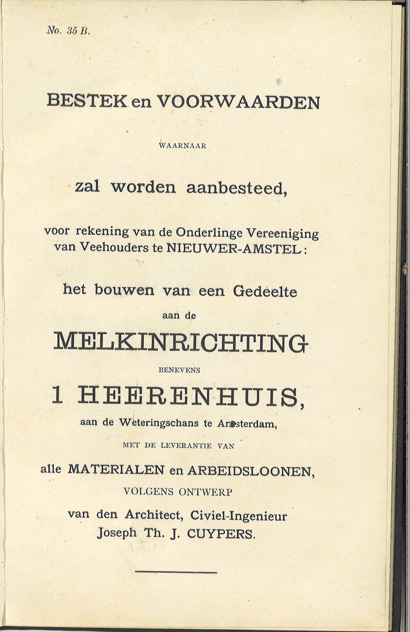 Bestek en voorwaarden waarnaar zal worden aanbesteed, voor rekening van de Onderlinge Vereeniging van Veehouders te Nieuwer- Amstel: het bouwen van een gedeelte aan de Melkinrichting benevens 1 heerenhuis aan de Weteringschans te Amsterdam, volgens ontwerp van den Architect, Civiel-Ingenieur Joseph Th.J. Cuypers. Bestek nr. 35 B. Zwarte kaft.