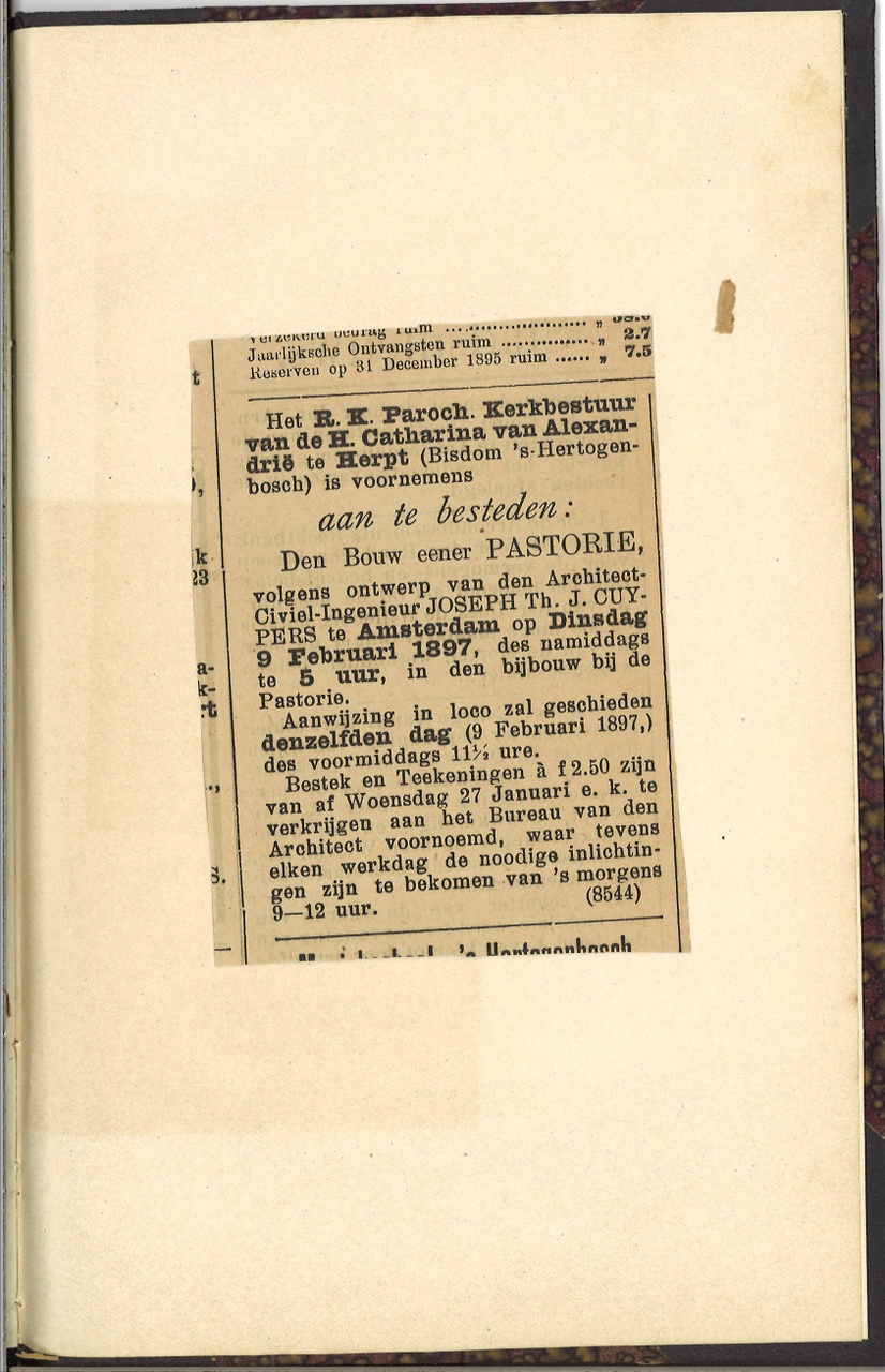 Bestek en voorwaarden volgens hetwelk zal worden aanbesteed: Het bouwen van de pastorie te Herpt, bisdom 's-Hertogenbosch, volgens ontwerp van den Architect-Civiel- Ingenieur Joseph Th.J. Cuypers. Bestek nr. 59. 30 pag. Met krantenknipsel: bericht van aanbesteding. Kaft met rood-bruin marmer- papier. Met aantekeningen in potlood.