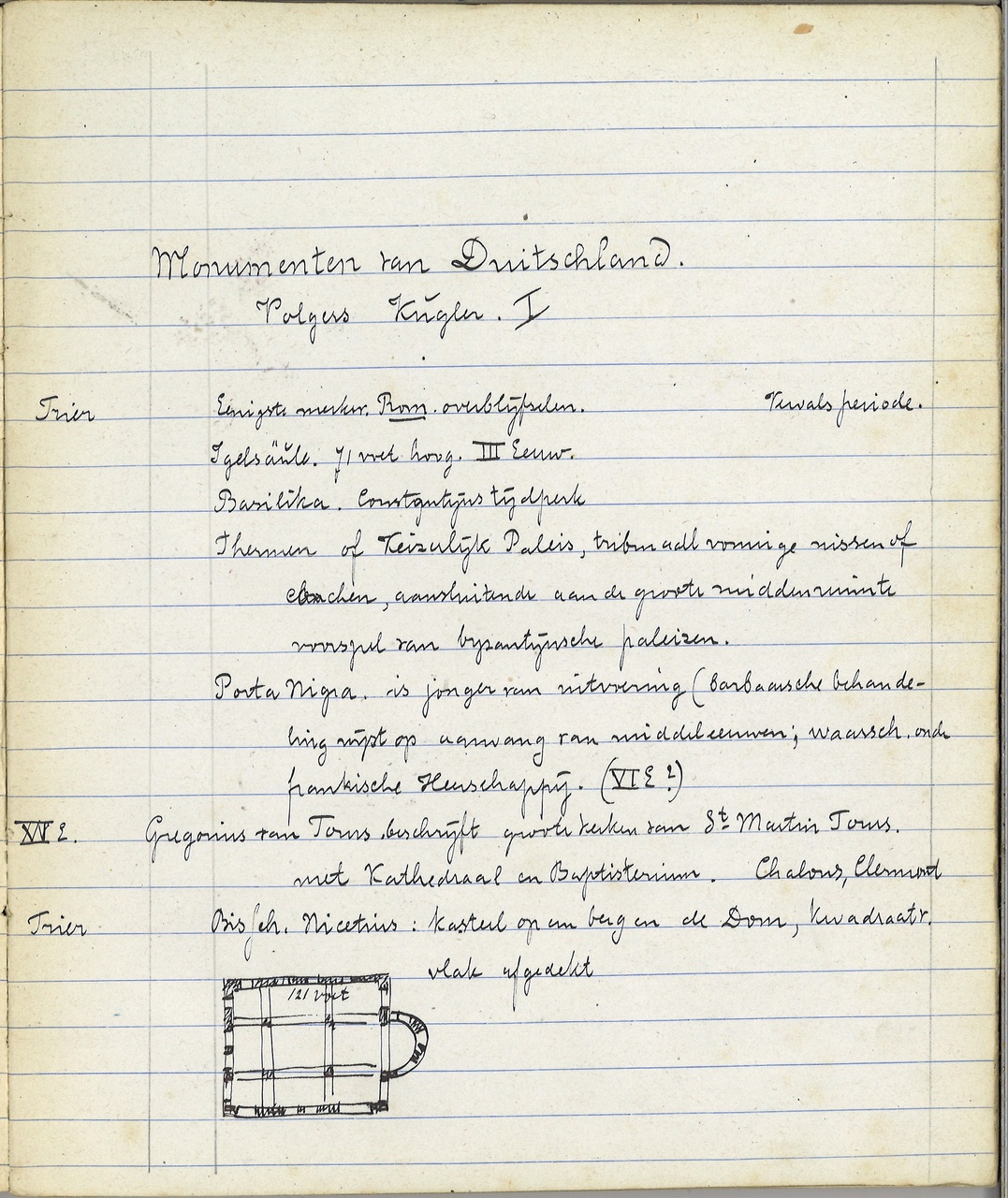Volgens Kügler I. Diverse monumenten in verschillende Duitse plaatsen. Op gelinieerd papier. Kaft met geel-bruin marmerpapier en etiket waarop: Duitsland Envelop met poststempel 27-8-85 gebruikt als notitieblad.