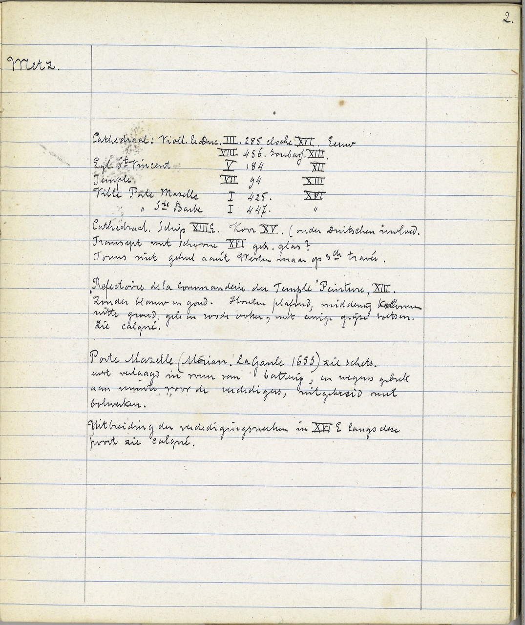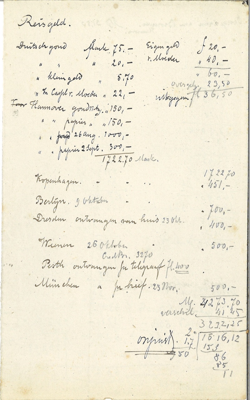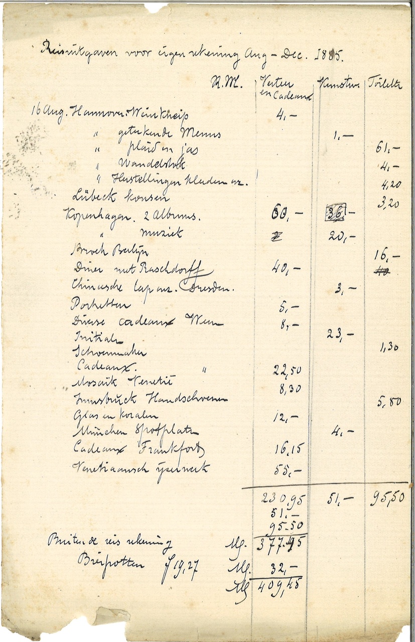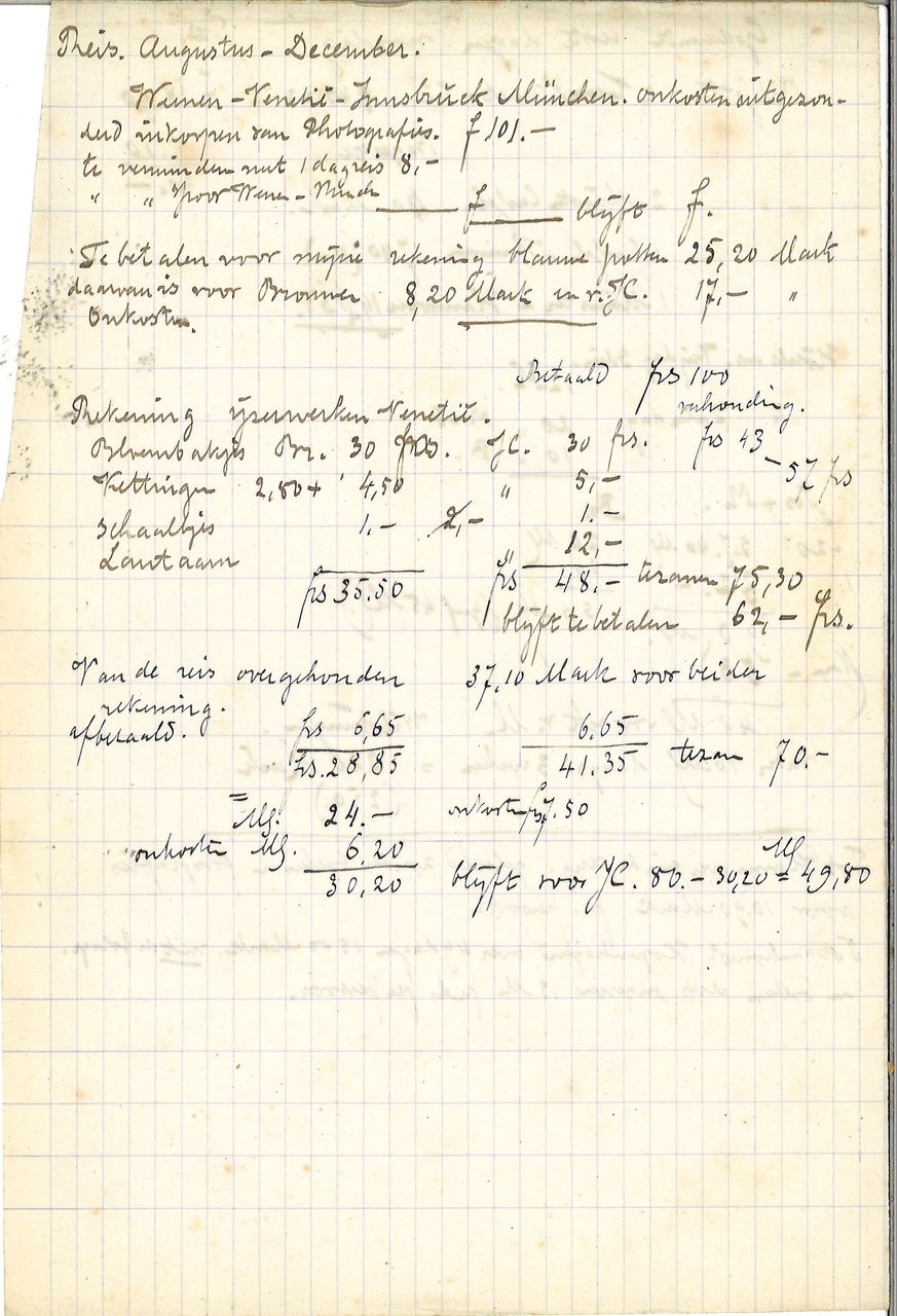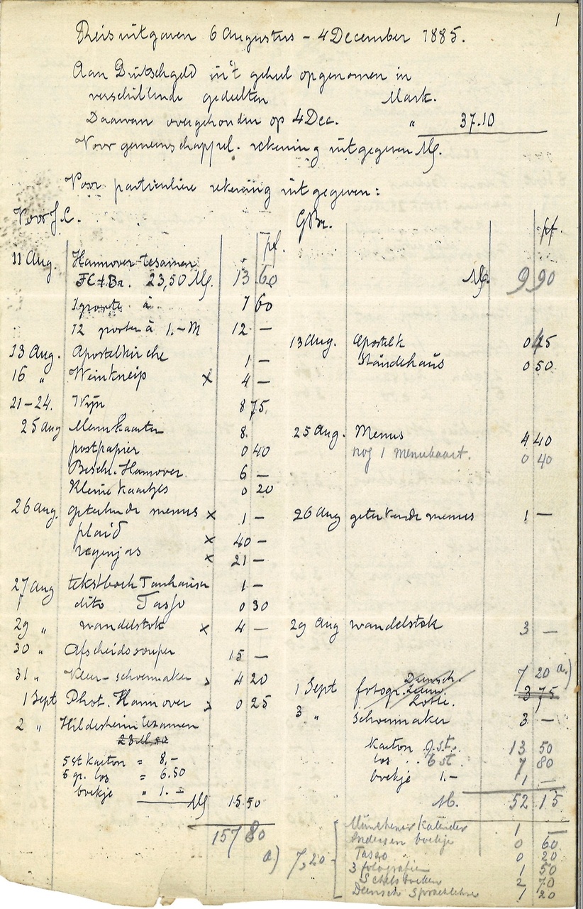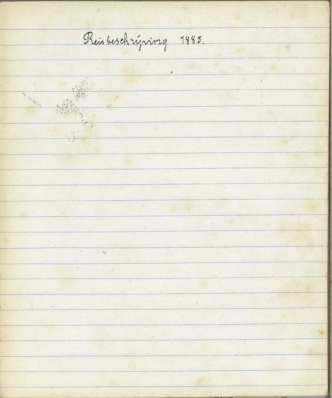 Reisbeschrijving 1885. o.a. bezocht: Venentië 27-2-1885, Rome 15-3-1885, Studiereis Italië voorjaar 1885. Tabellen met div. plaatsen: vertrek en aankomst datum en tijdstip, vermelding van Hotel. Tevens kasboek met totaal opgenomen geld gedurende de reis (9 febr. - 5 maart). Achterin div. briefjes en kosten reis aug-dec. Kaft met geel-bruin marmerpapier.