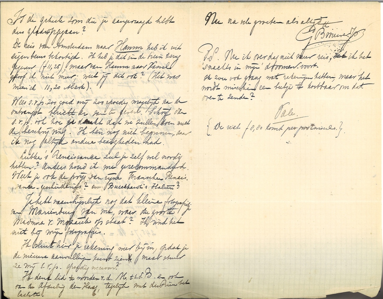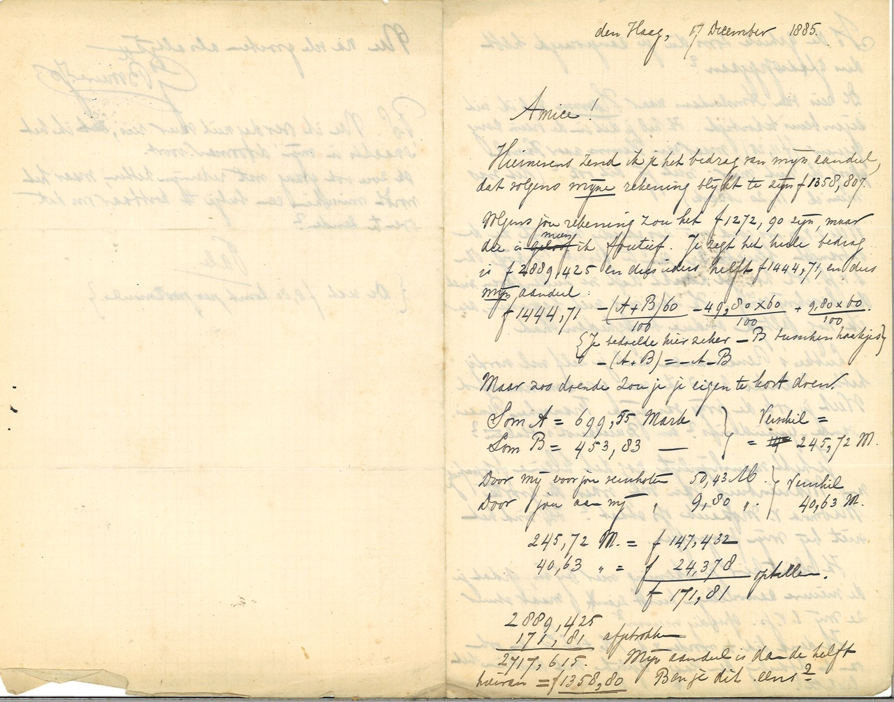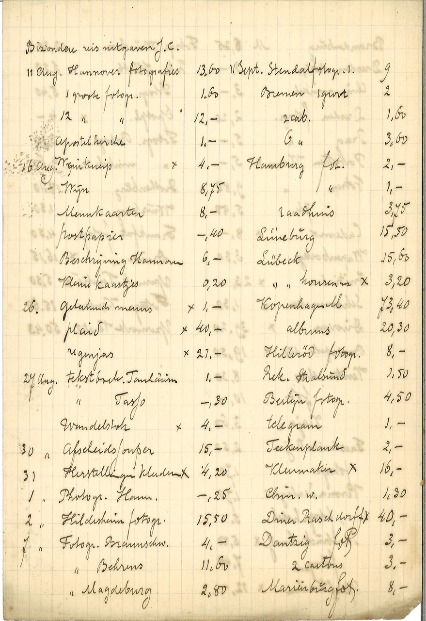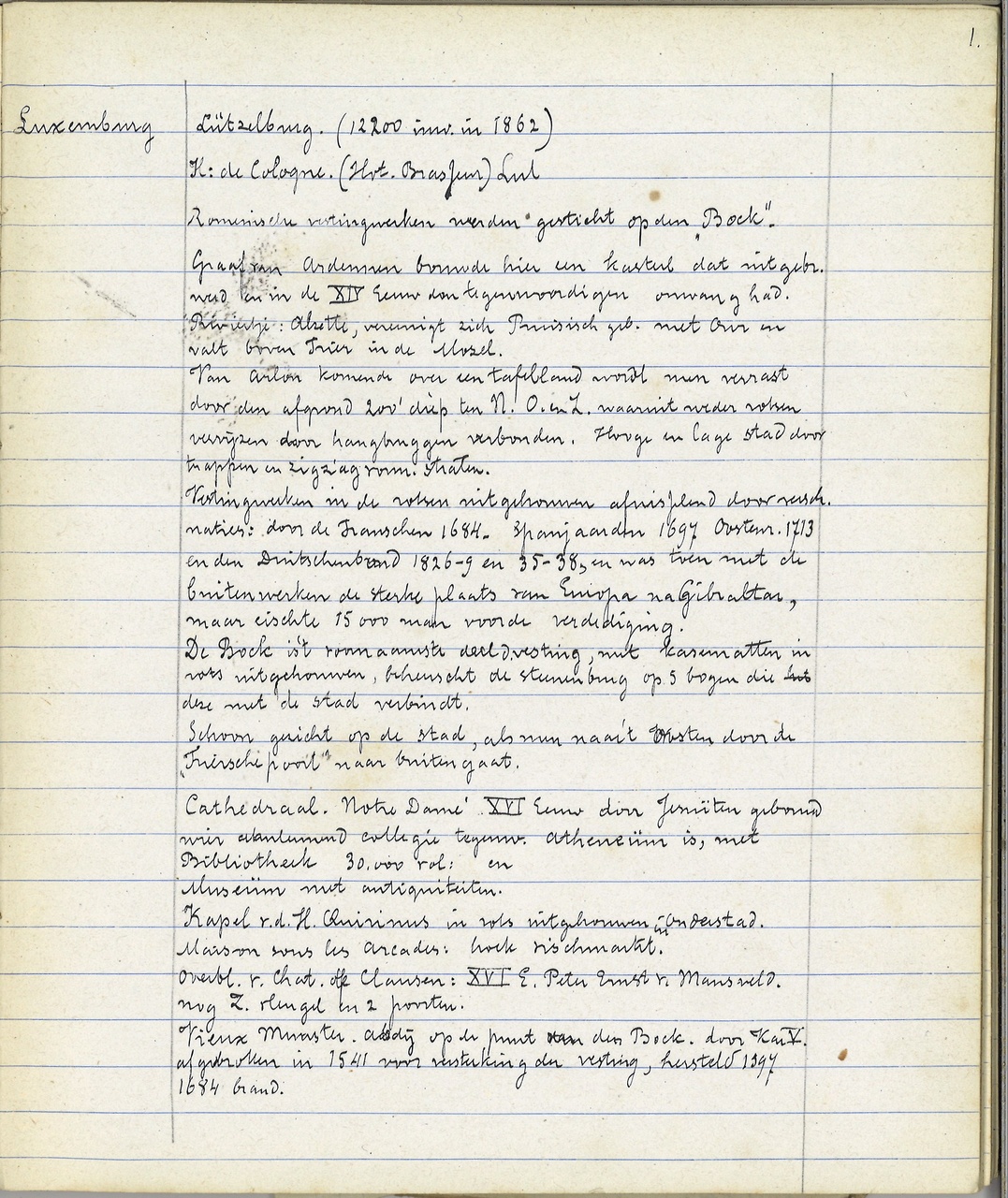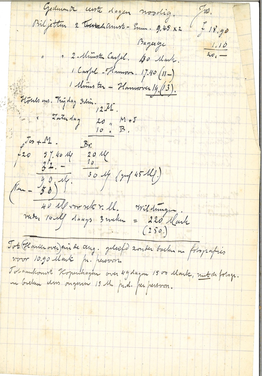 Reisbeschrijving 1885. o.a. bezocht: Venentië 27-2-1885, Rome 15-3-1885, Studiereis Italië voorjaar 1885. Tabellen met div. plaatsen: vertrek en aankomst datum en tijdstip, vermelding van Hotel. Tevens kasboek met totaal opgenomen geld gedurende de reis (9 febr. - 5 maart). Achterin div. briefjes en kosten reis aug-dec. Kaft met geel-bruin marmerpapier.