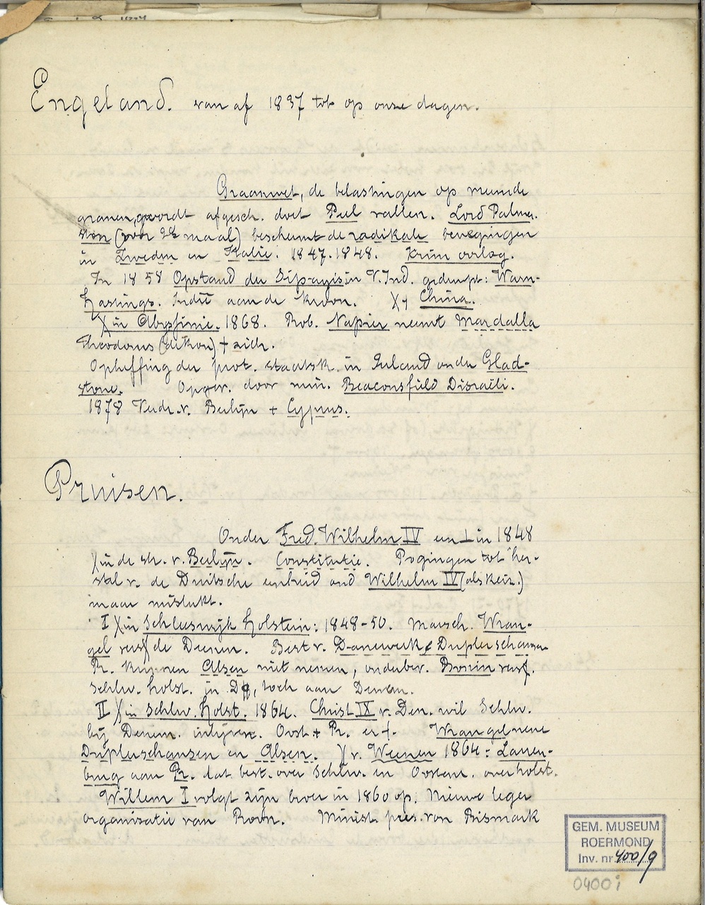 Blauw schrift met aantekeningen betreffende geschiedenis.