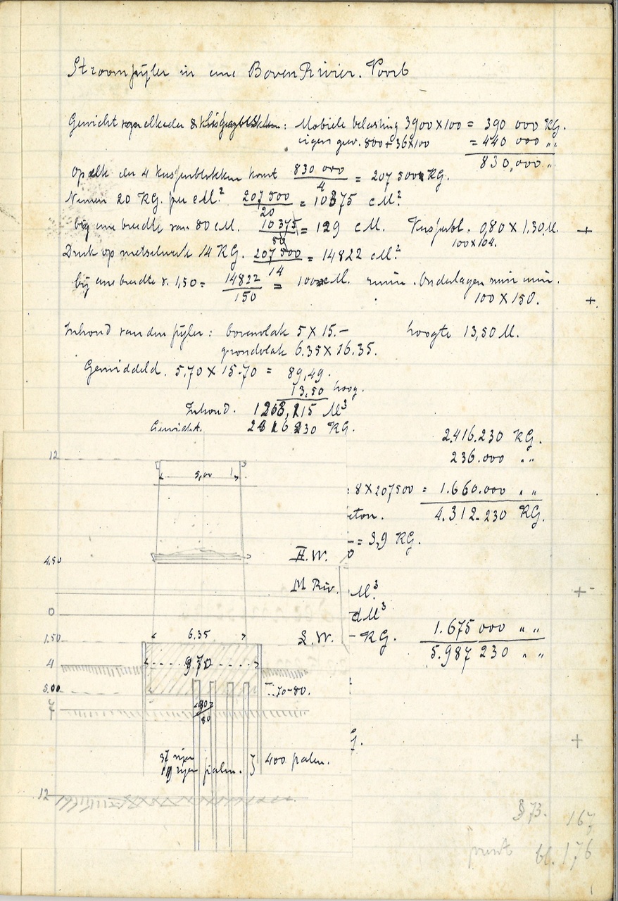 Schrift met aantekeningen en tekeningen betreffende waterbouwkunde. Ook losse aantekeningen op blaadjes, o.a. verslag van een excursie naar Dordrecht Met bruin verharde kaft.