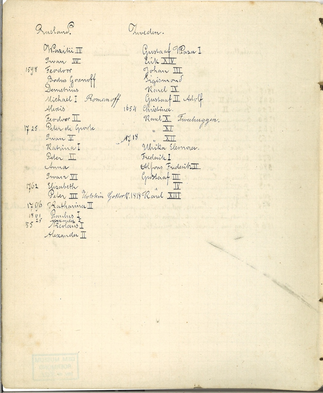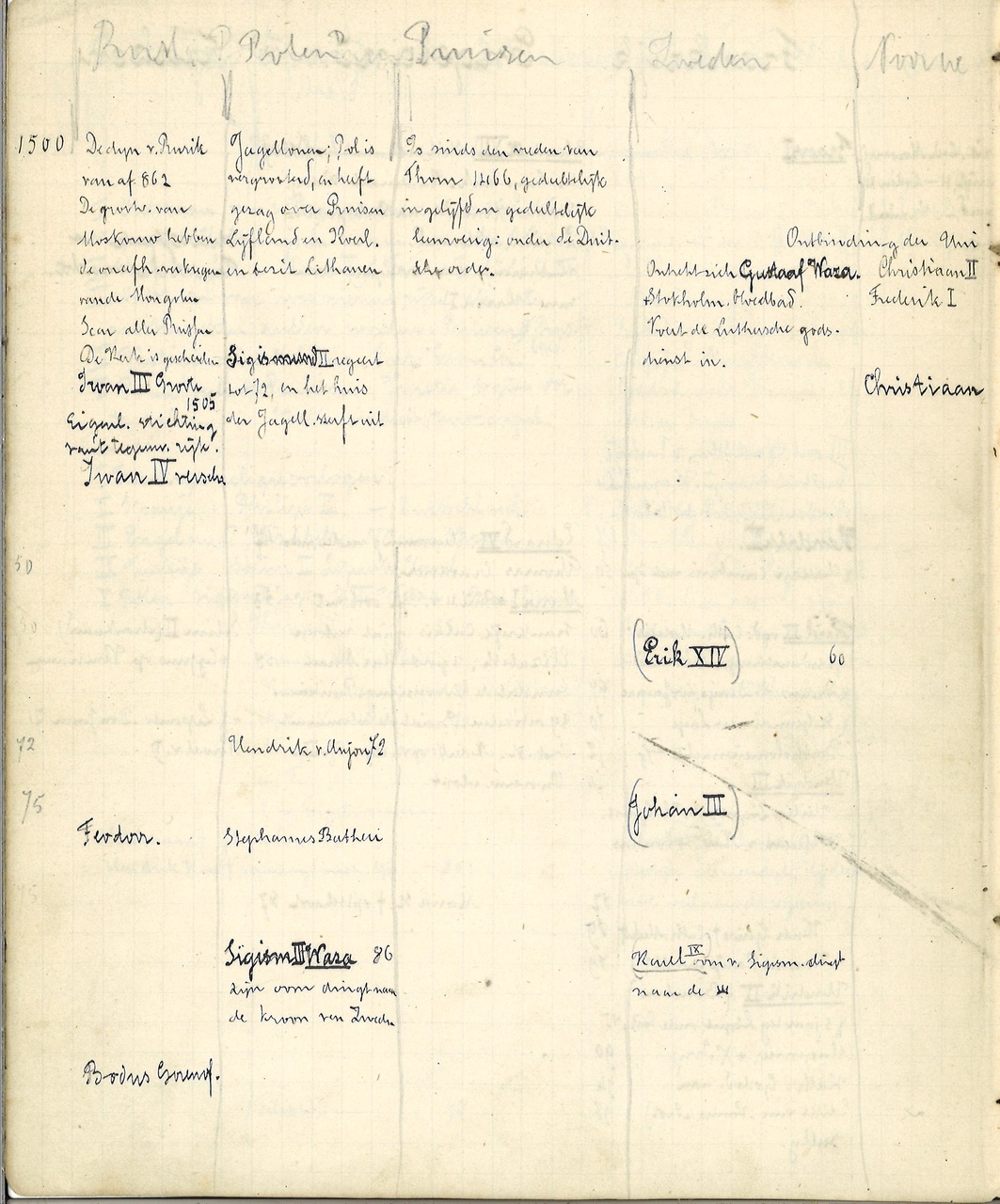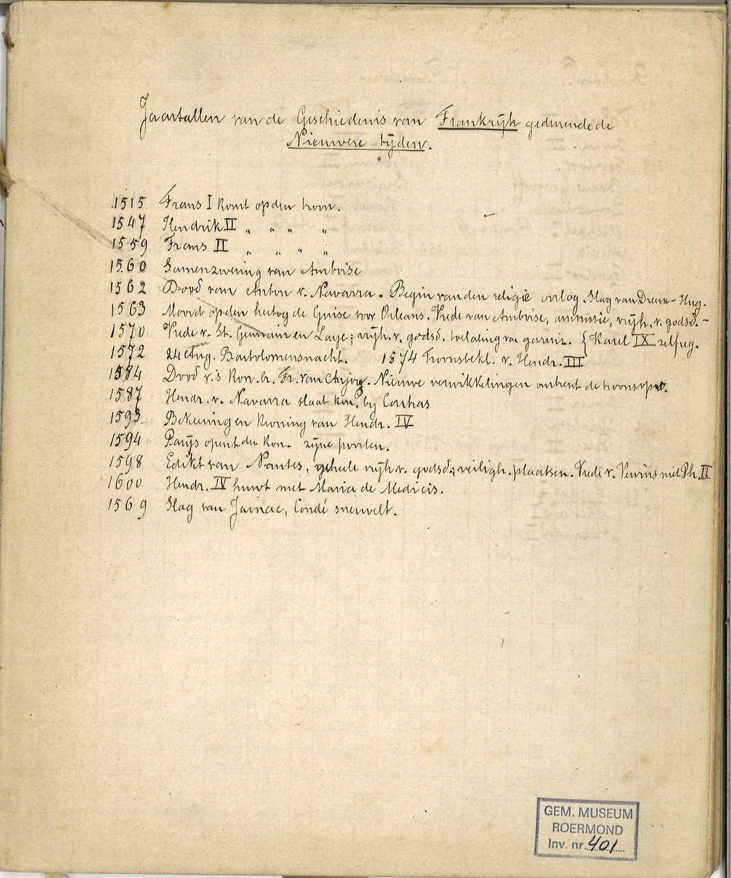 Blauw schrift met geruit papier. Aan twee kanten begonnen met aantekeningen in pen. Belangrijke jaartallen in de geschiedenis van diverse landen, Staatshuishoudkunde, Aardrijkskunde, Plantenkunde etc.