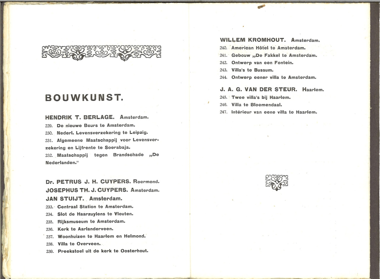 Deel bouwkunst: nrs. 233-239: Dr. Petrus J.H. Cuypers, Roermond/ Josephus Th.J. Cuypers, Amsterdam/ Jan Stuyt, Amsterdam.: Vermelding van: Centraal Station A'dam, Slot de Haarzuylens, Vleuten, Rijksmuseum Amsterdam, Kerk te Aarlanderveen, Woonhuizen Haarlem en Helmond, Villa Overveen, Preekstoel Oosterhout