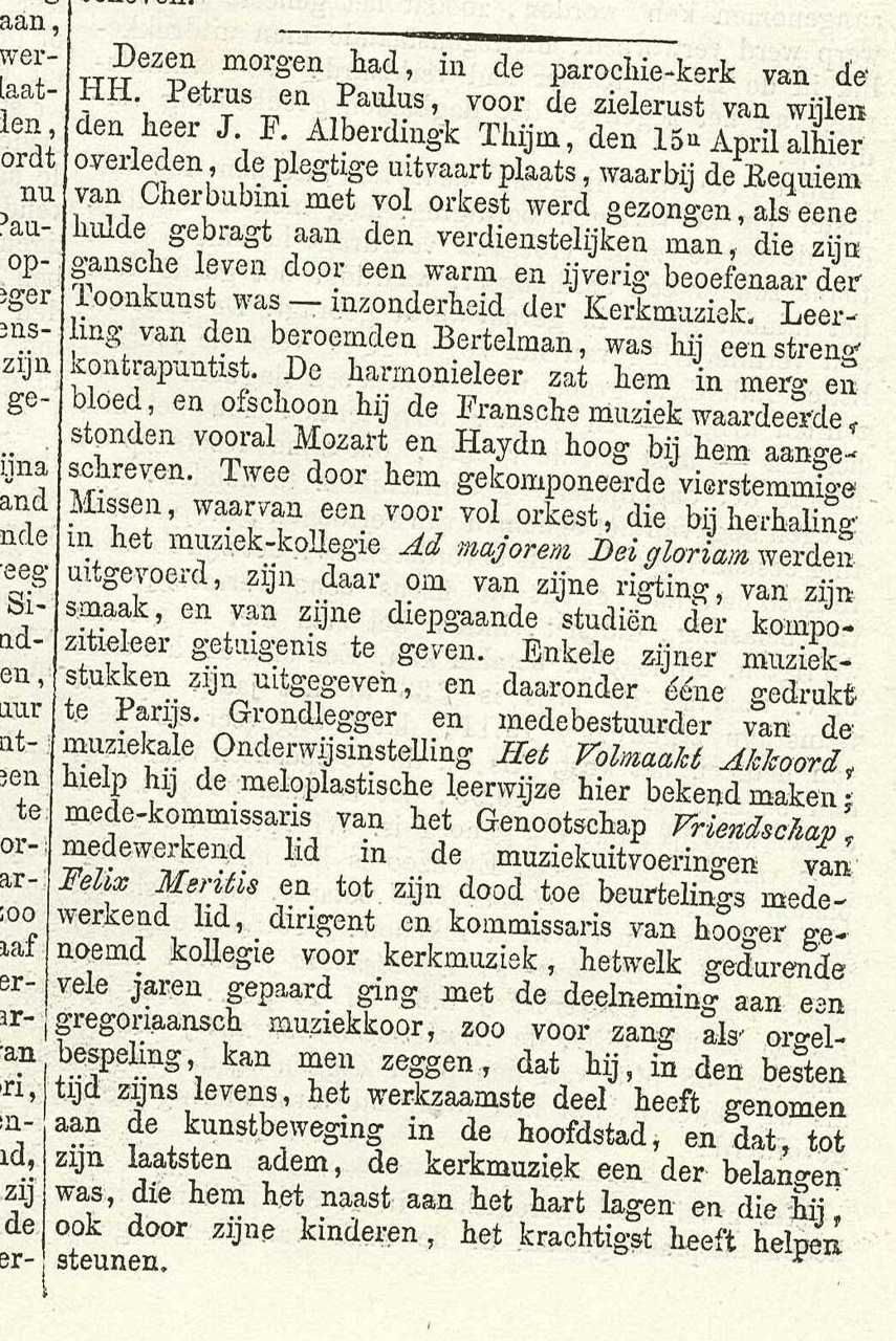 Bericht van de uitvaart van Y.F. Alberdingk Thijm (overleden 15 april 1858), op voorpagina en op 2e pagina. Nr. 3339