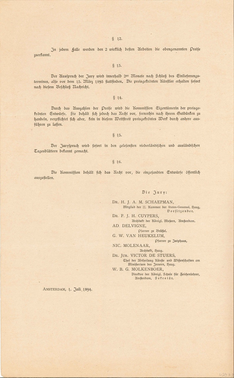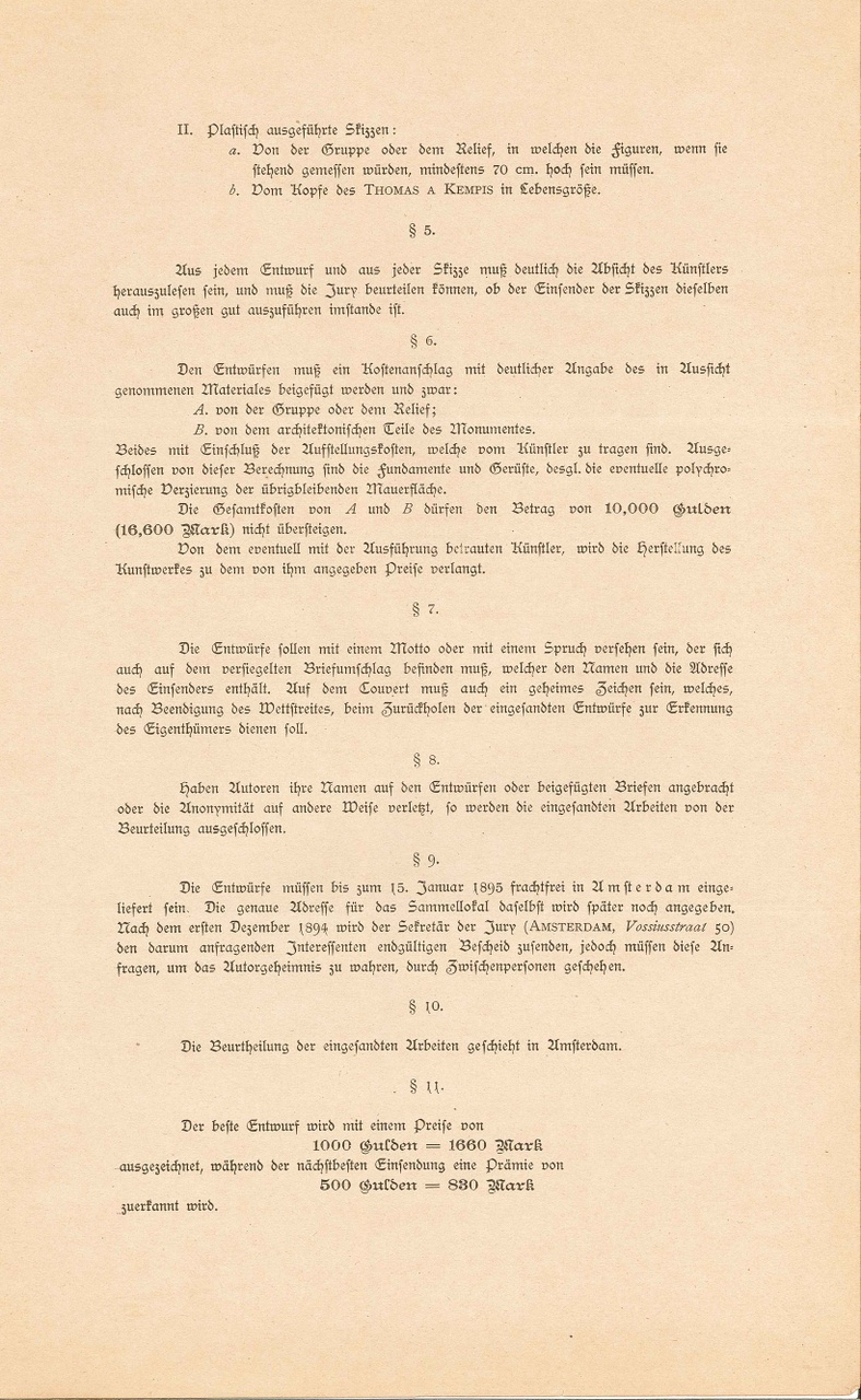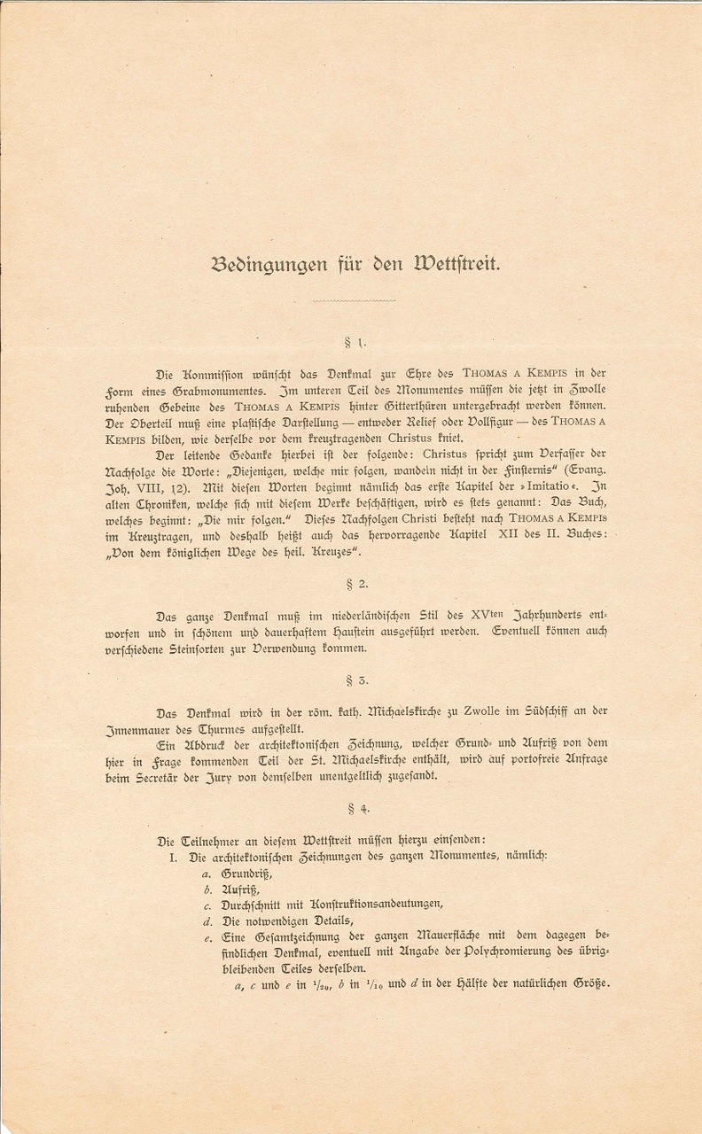Denkmal für den ehrwürdigen Diener Gottes Thomas a Kempis. In het duits opgesteld. Cuypers is jury-lid. 1 juli 1894.