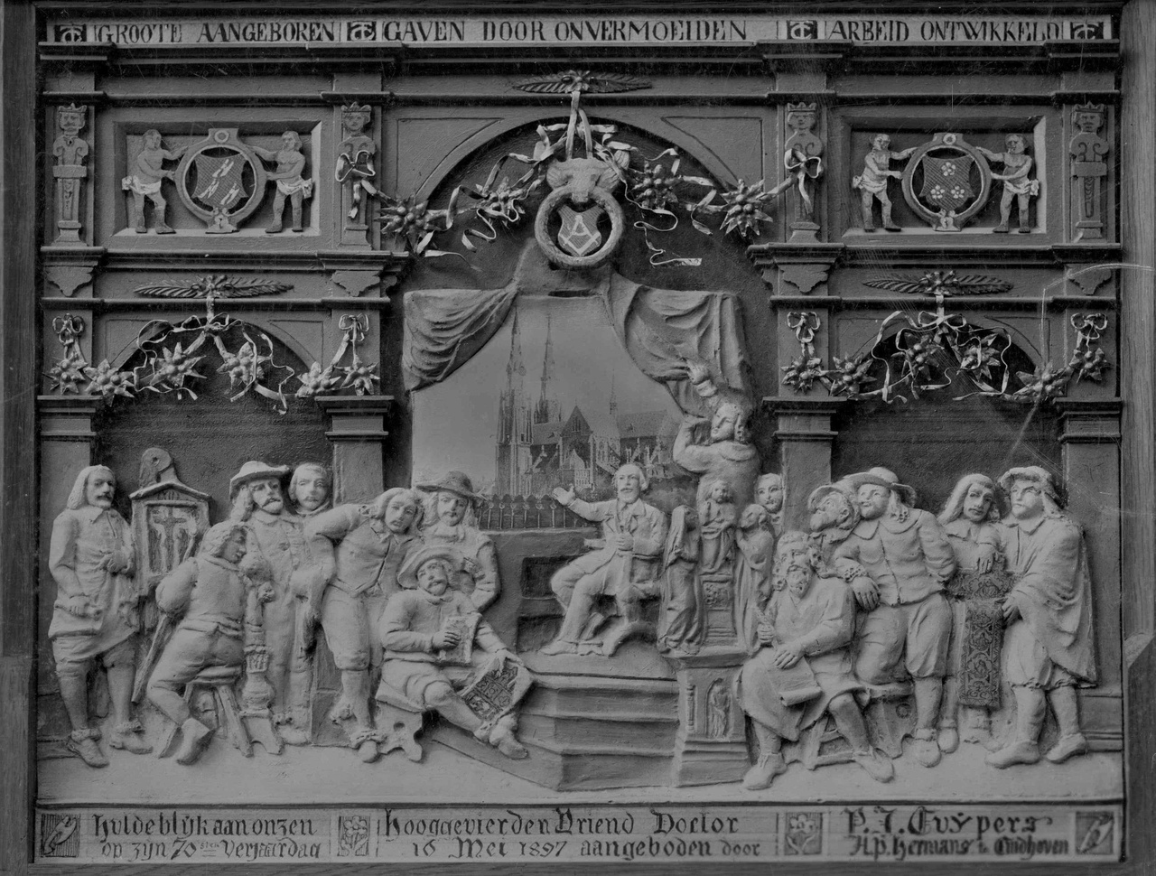 Tekst onder: Huldelijk aan onzen hooggevierden Vriend Doctor P.J.H. Cuypers op zijn 70sten verjaardag 16 Mei 1897 aangeboden door H.P. Hermans Eindhoven