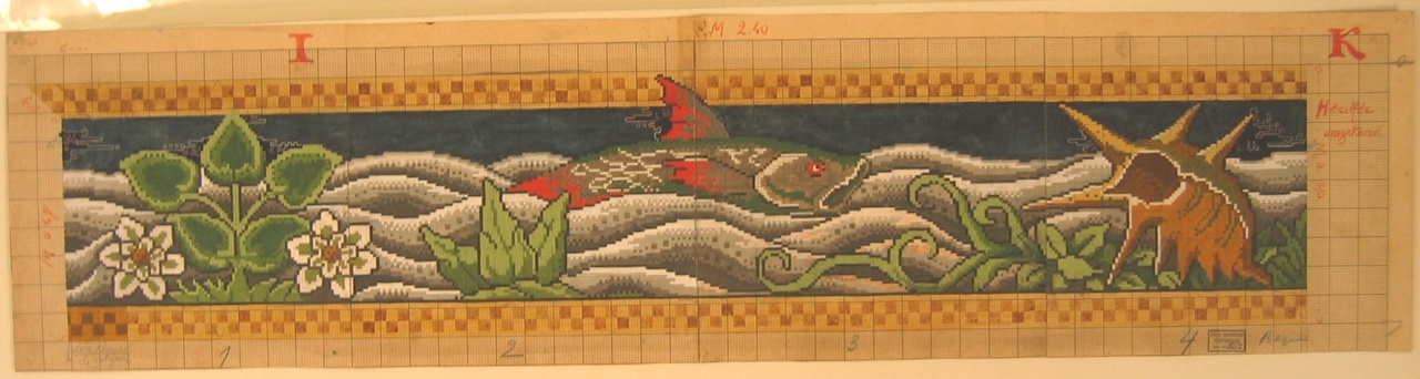 Detailpatroon van inv.nr. 0671. Vissen, kreeft en aapachtig dier in hoek latijnse tekst.