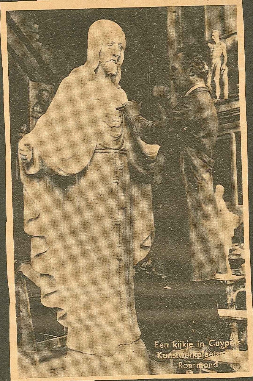Op foto 0662-10bis een beeldhouwer bezig met een levensgroot H. Hartbeeld. Het bijschrift luidt: "Een kijkje in Cuypers' Kunstwerkplaatsen Roermond".