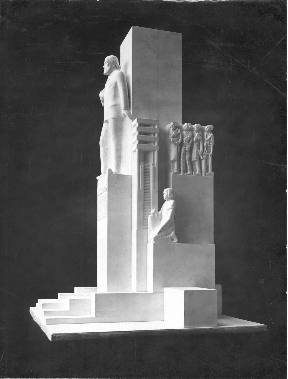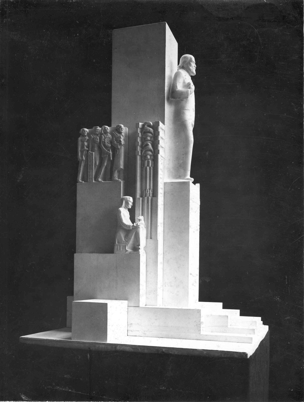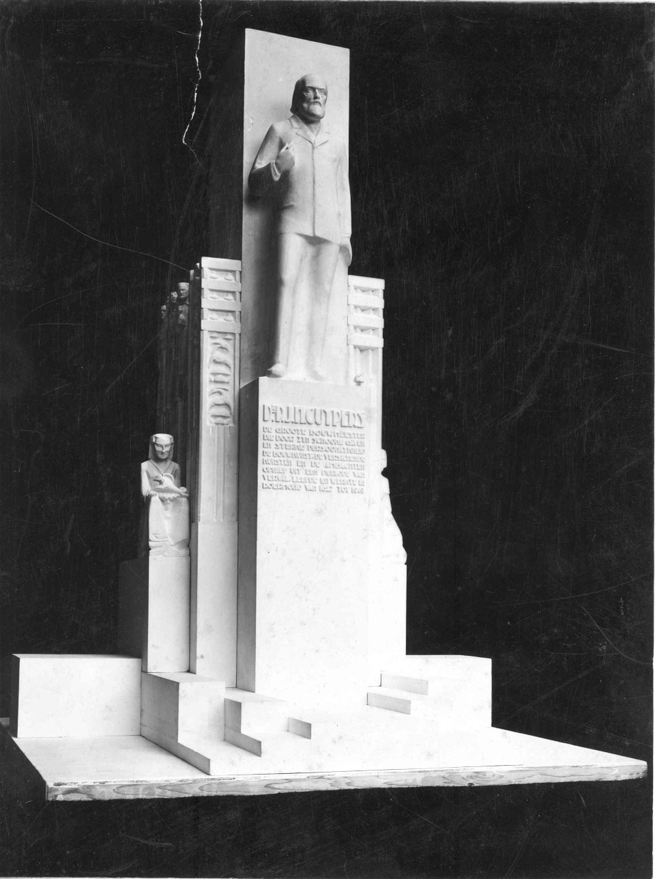 In 4 foto's wordt het ontwerp getoond. Er is een staande dr. Cuypers afgebeeld geflankeerd door twee muzen. Dr. Cuypers houdt zijn rechterhand op zijn borst. aan de zijkanten van het ontwerp zijn mannen en vrouwen afgebeeld.