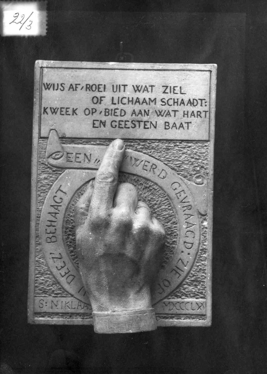 Foto -03 toont een gipsafdruk van de hand van Pierre Cuypers. Deze gipsafdruk is gebruikt op Sinterklaasavond 1887. Er staat o.a. op: "Wijs af, roei uit, wat ziel of lichaam schaadt. Kweek op, bied aan wat hart en geesten baat". Zie ook objectnr. BR 0034.