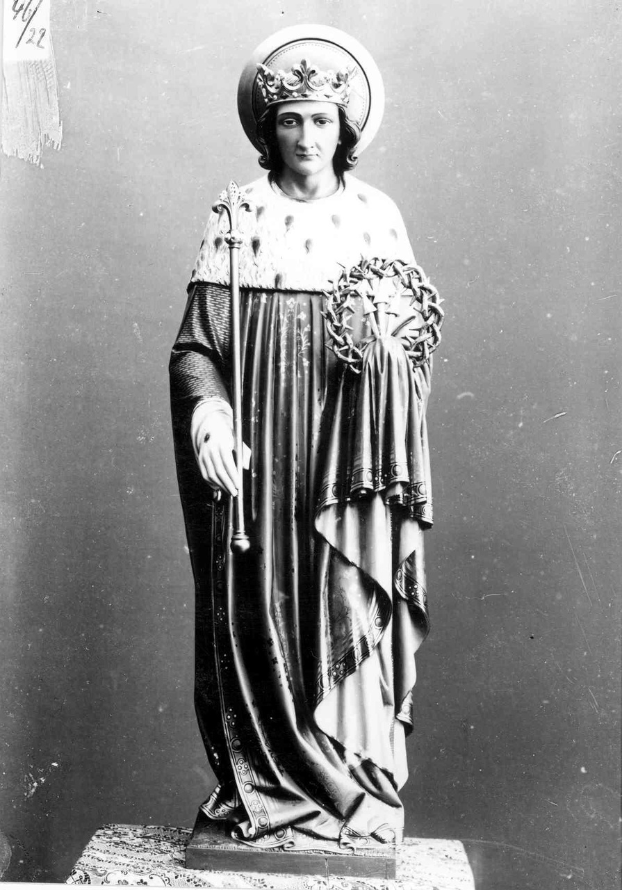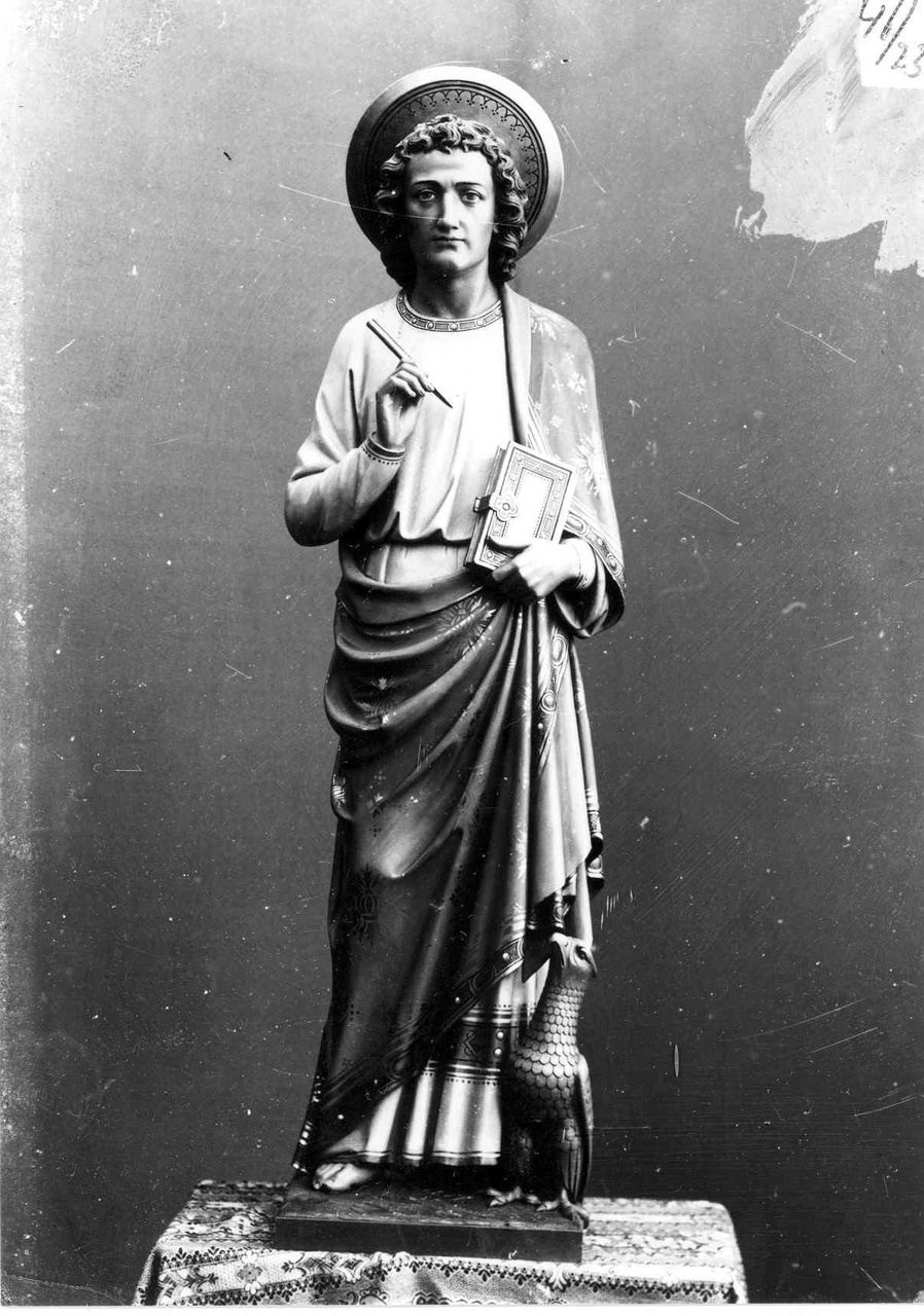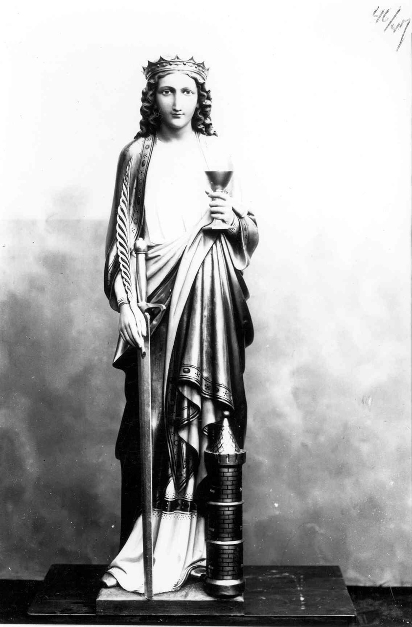 Op foto -37 staat een beeld van een heilige met zwaard en kelk.