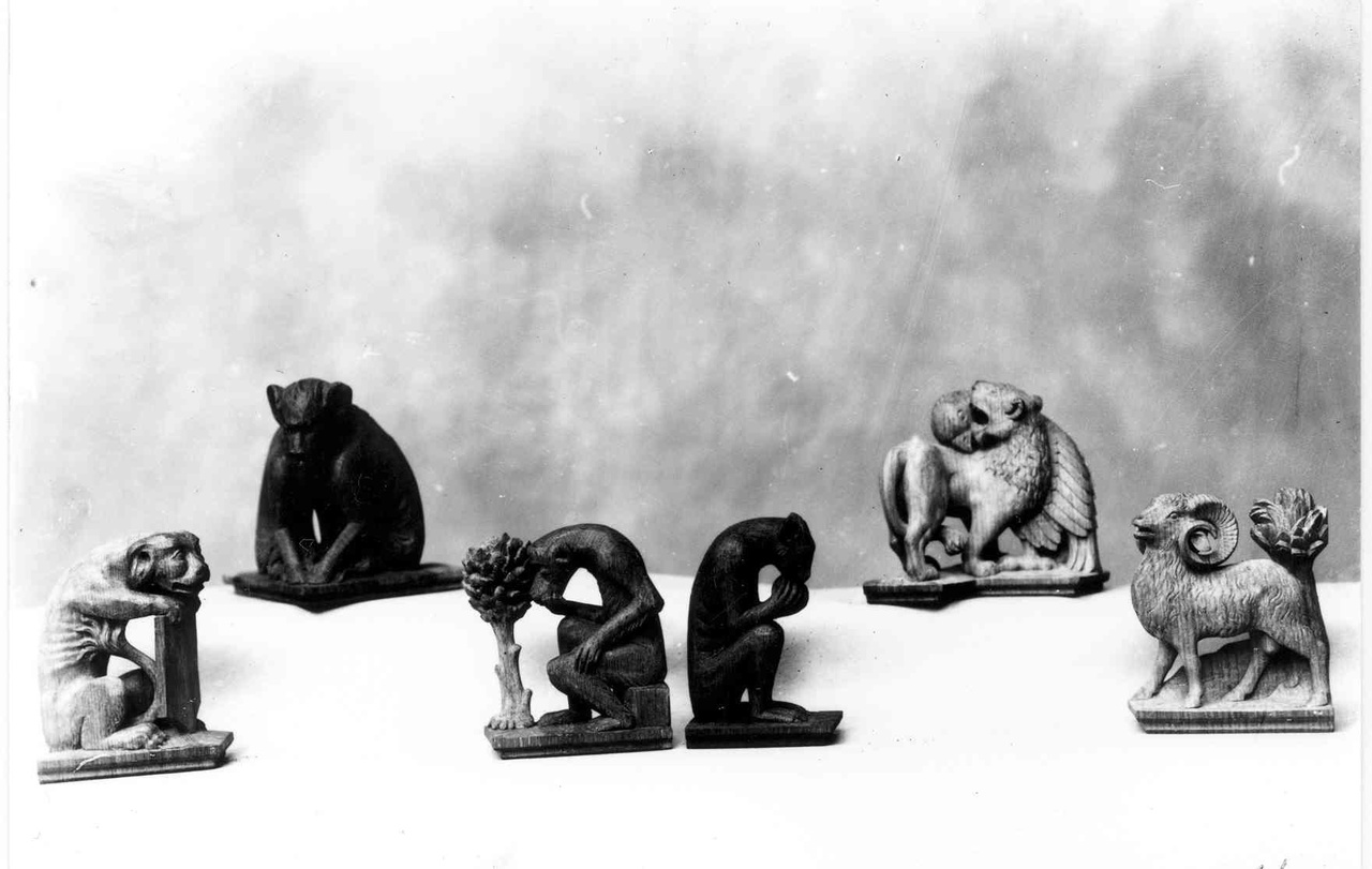 Foto -20 toont drie houten reliëfs en op foto -21 staan vier dierfiguren en op -22 zes.