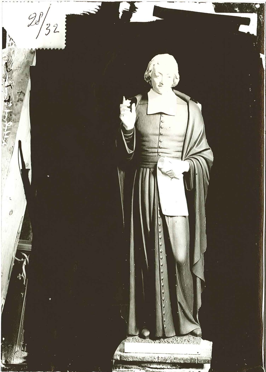 Op -27 een beeld van een geestelijke met een boek, op -28 met een ganzenveer, op -29 met Christus en op -30 met een kelk.