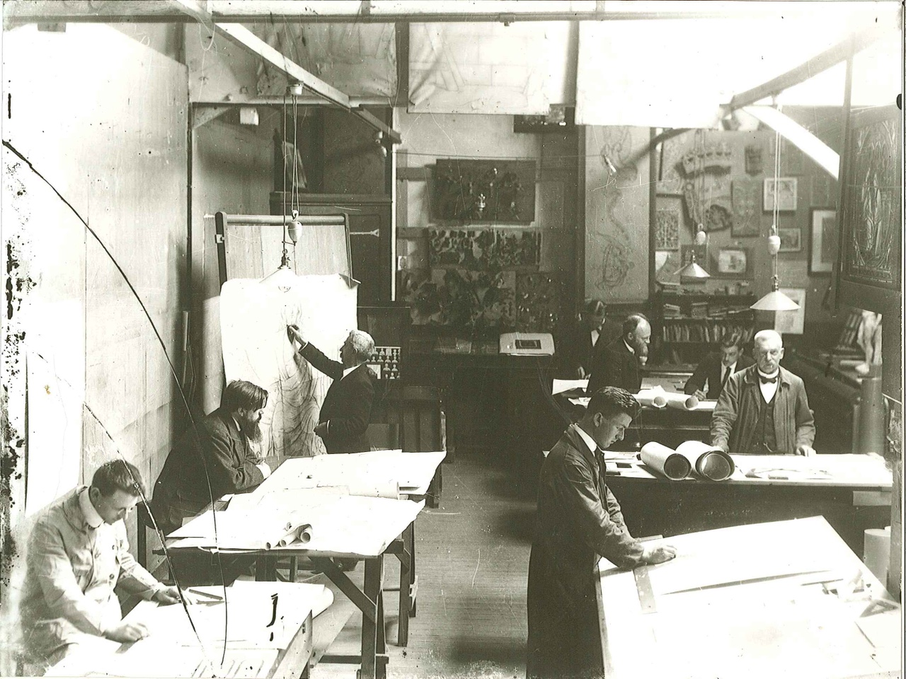 Op -34, -35, -36, en -37 staan gedeeltes van de werkplaatsen van Cuypers met personeel afgebeeld.