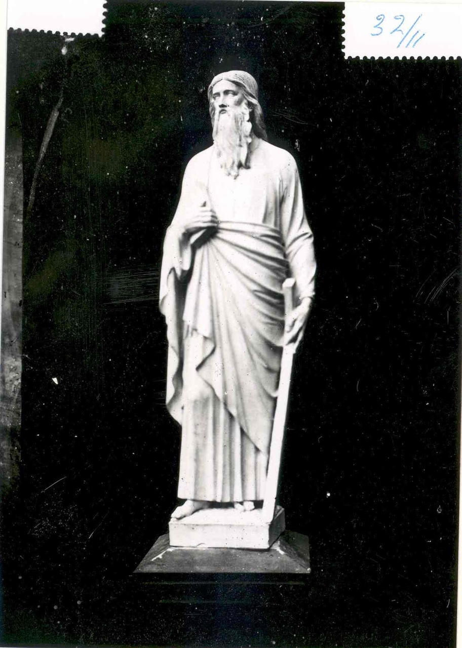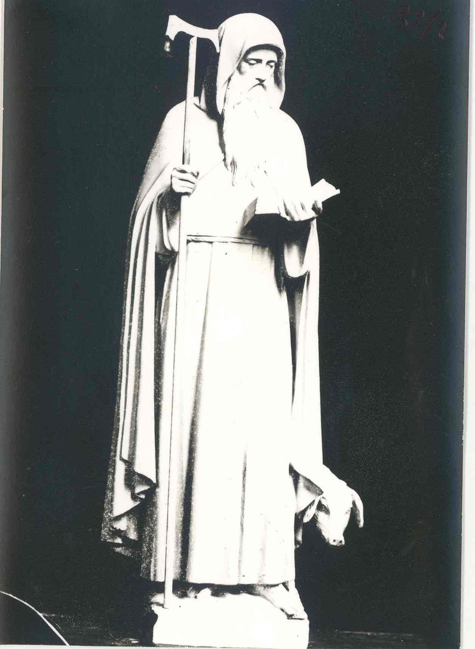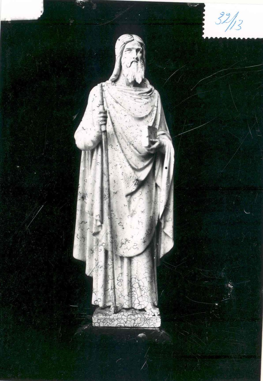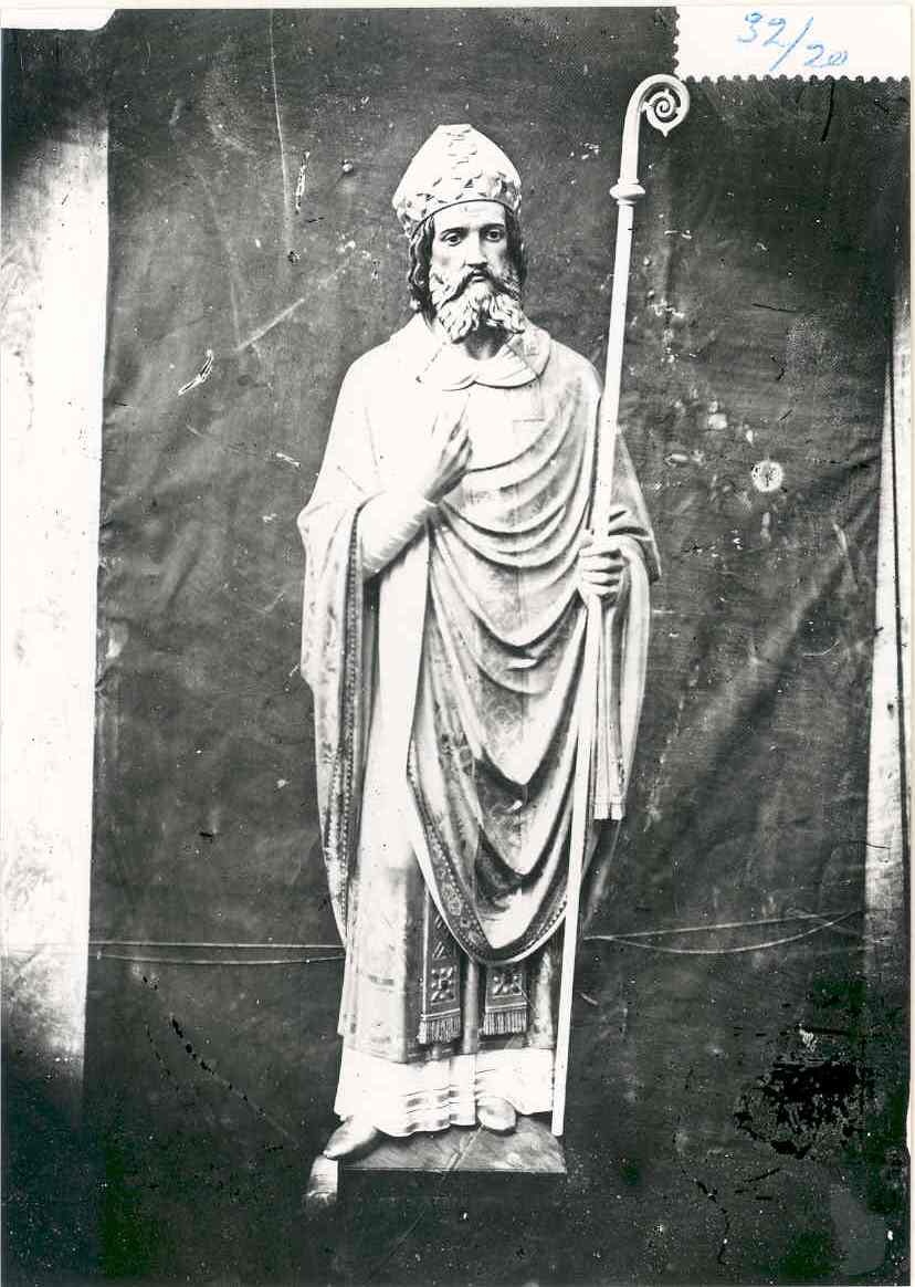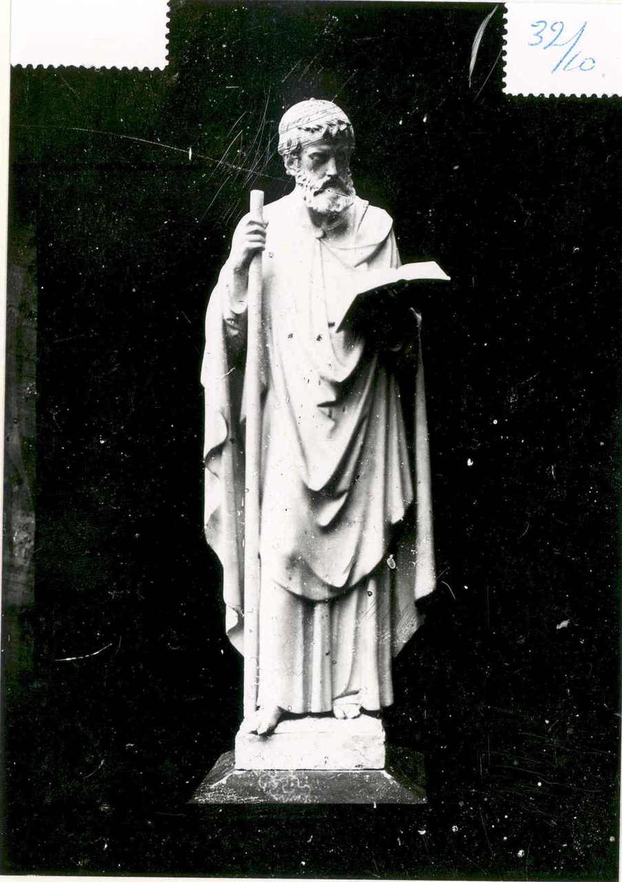 De foto's -10 en -13 tonen een beeld van een heilige met boek en staf.