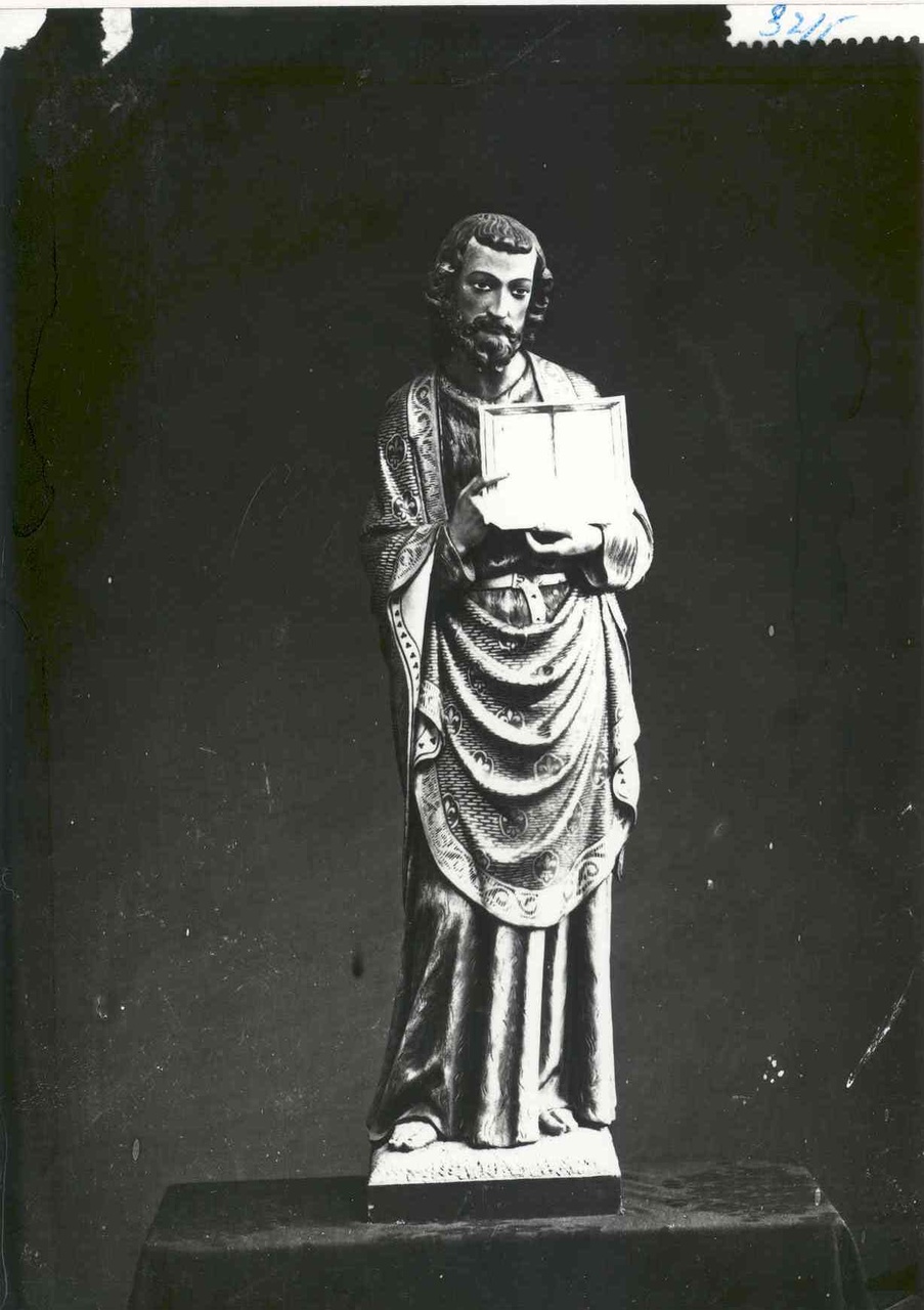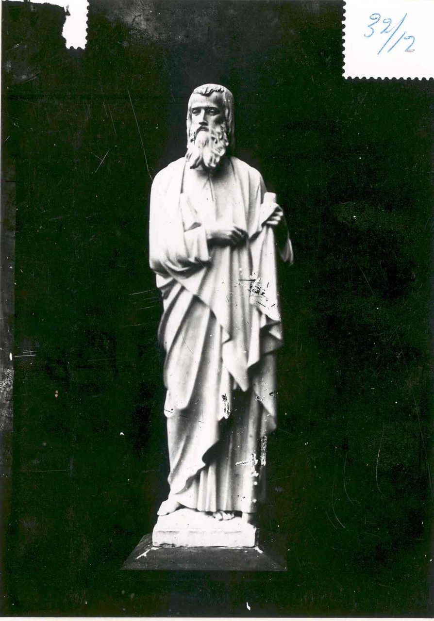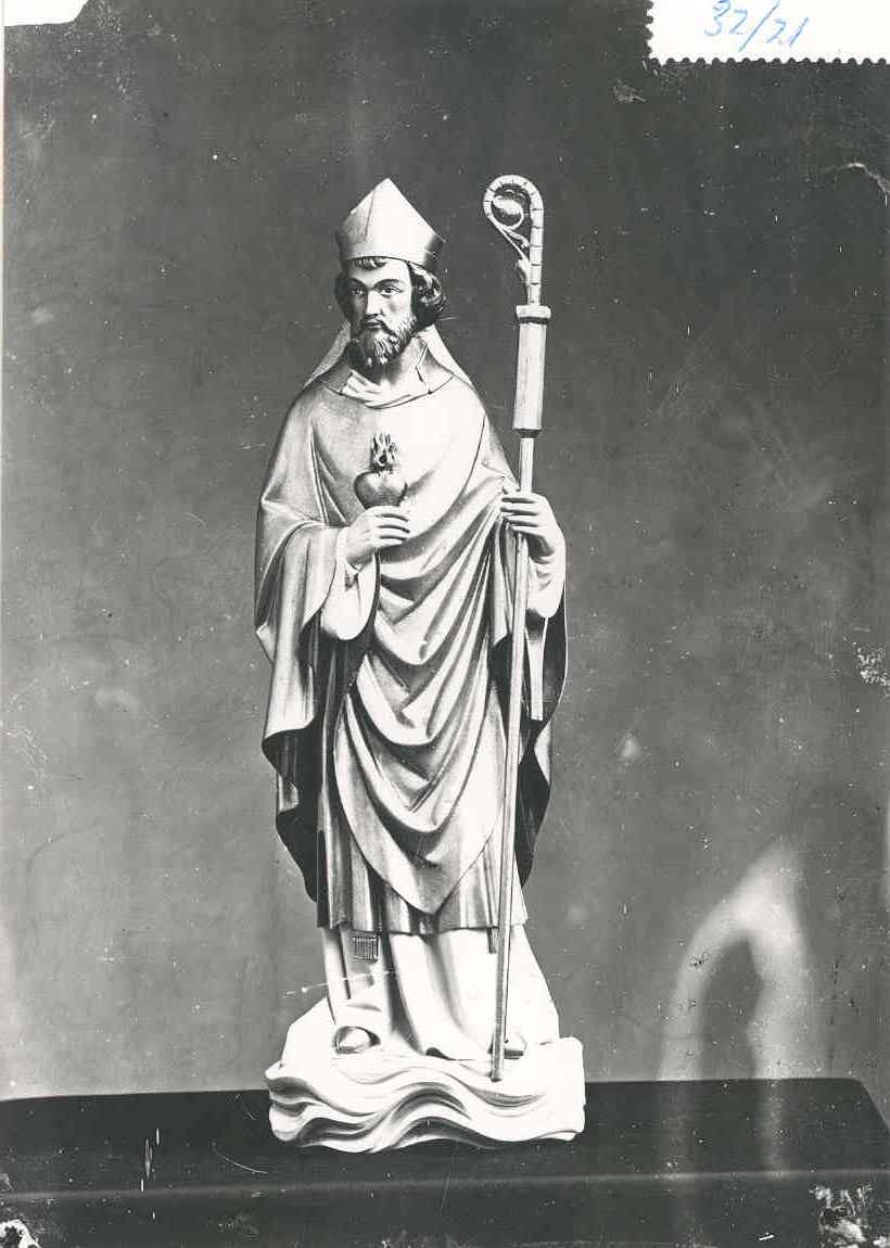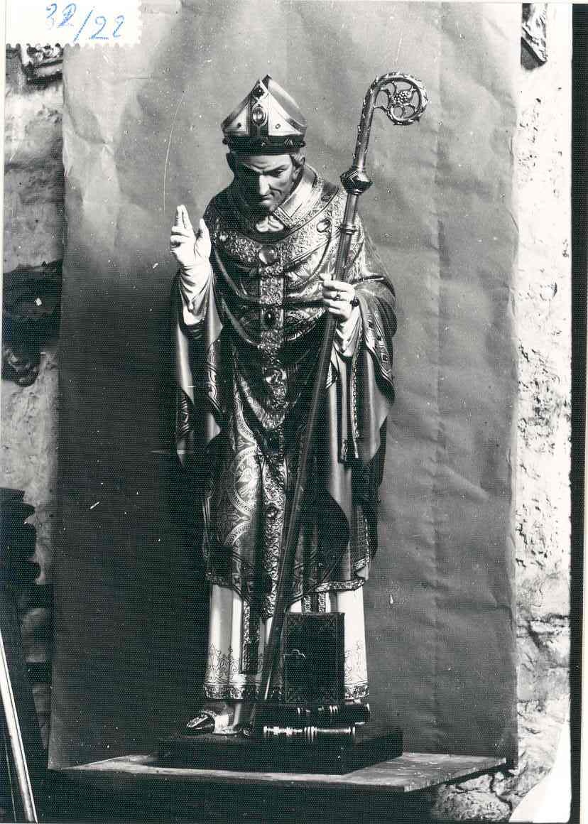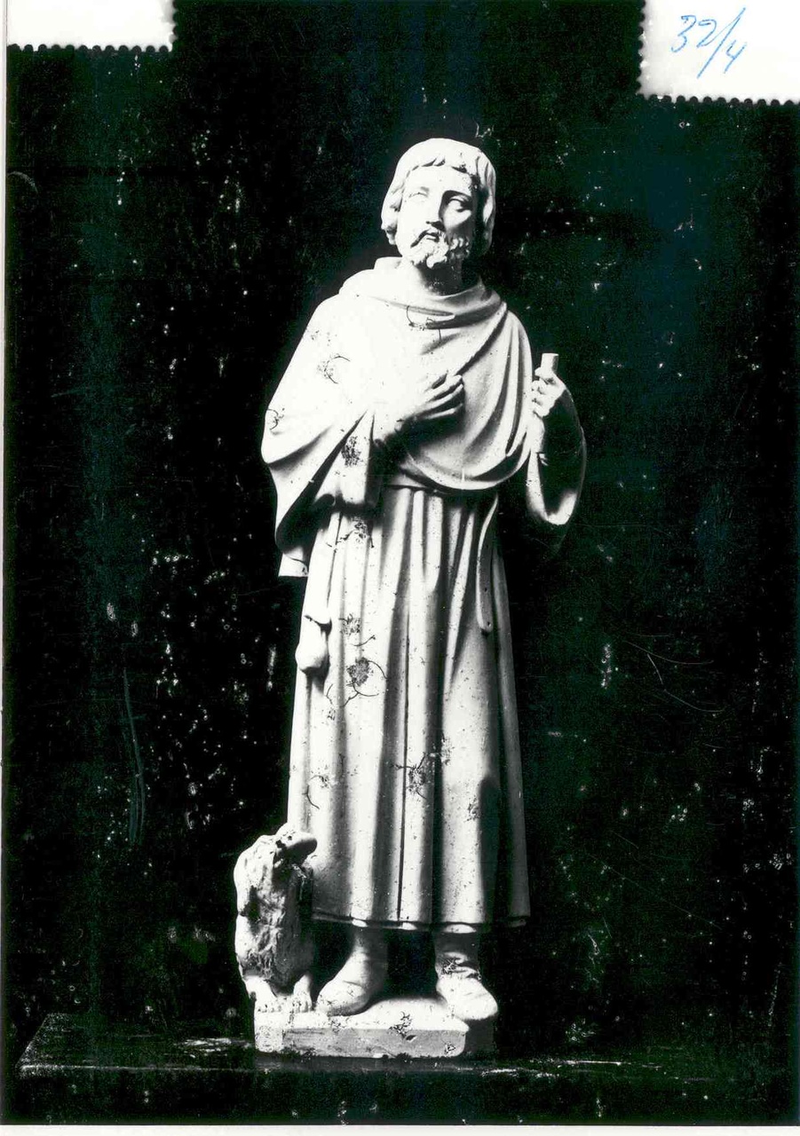 De foto's -10 en -13 tonen een beeld van een heilige met boek en staf.