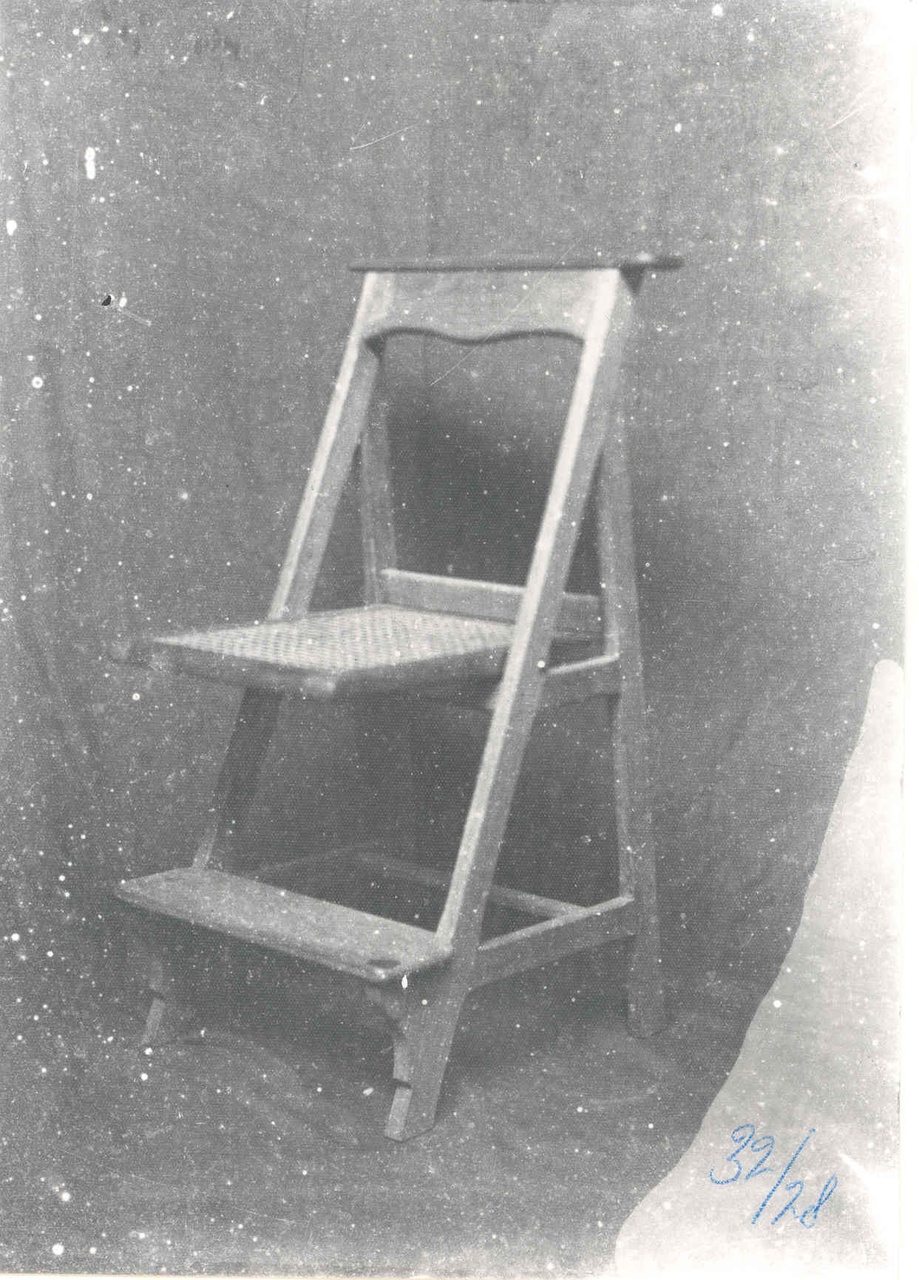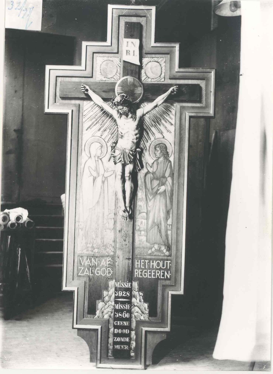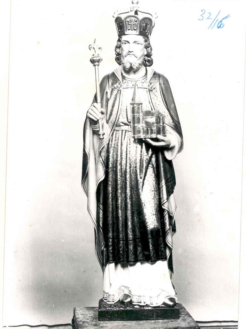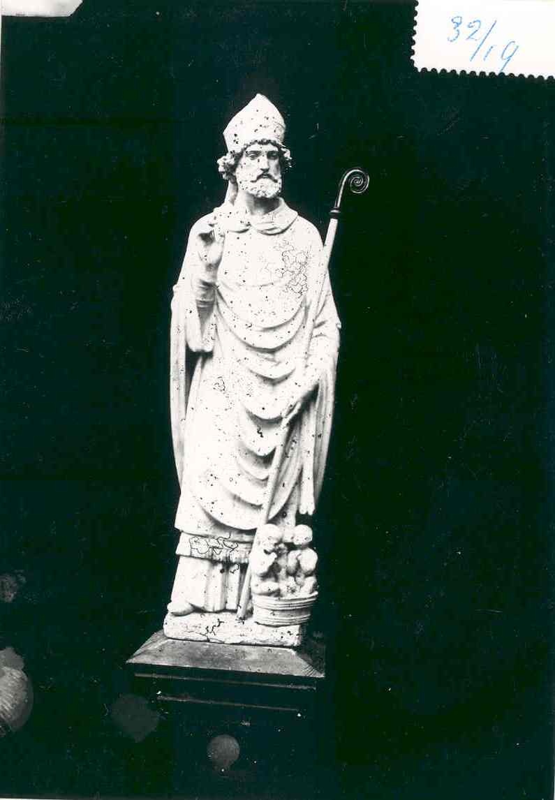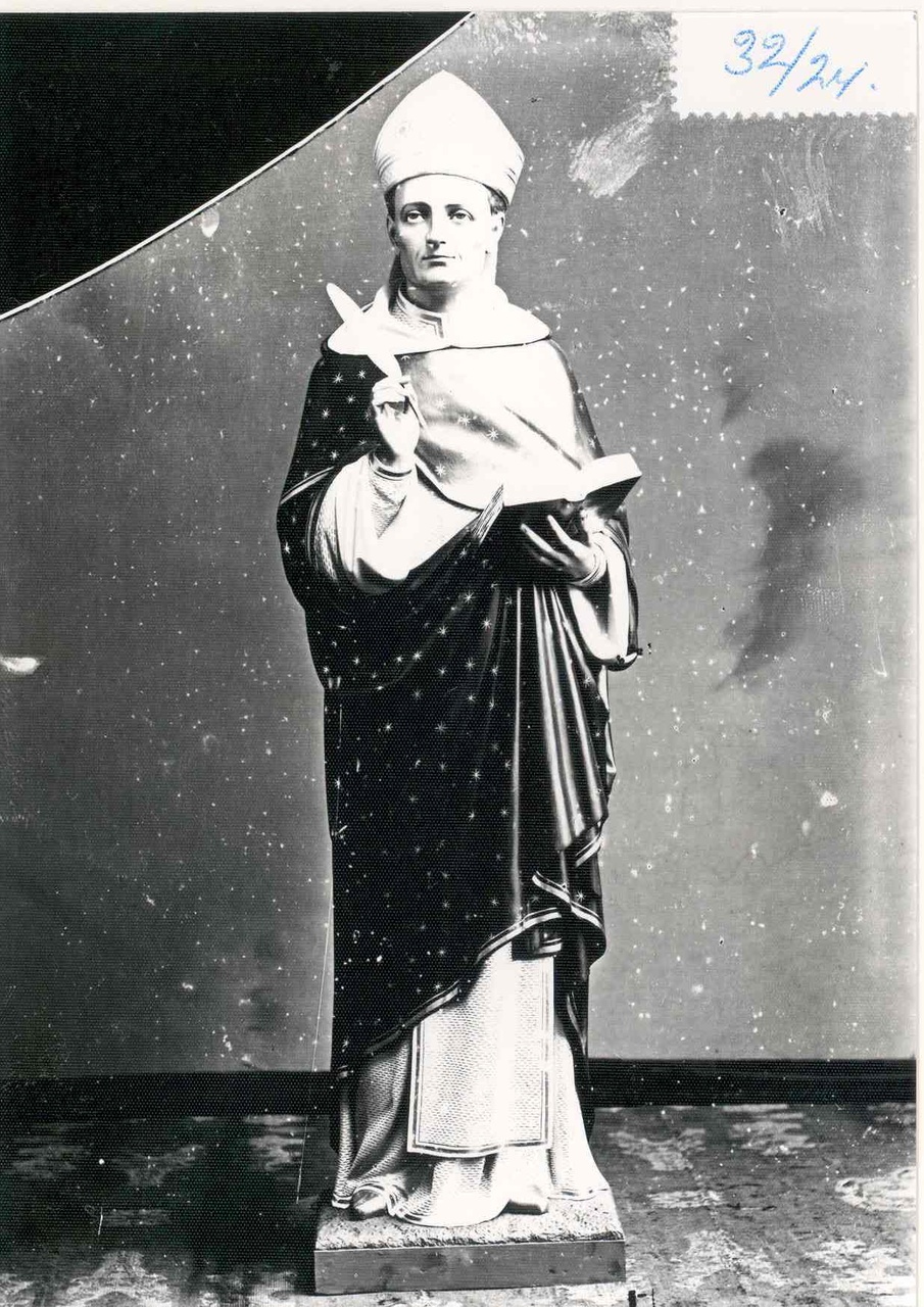 De foto's -10 en -13 tonen een beeld van een heilige met boek en staf.