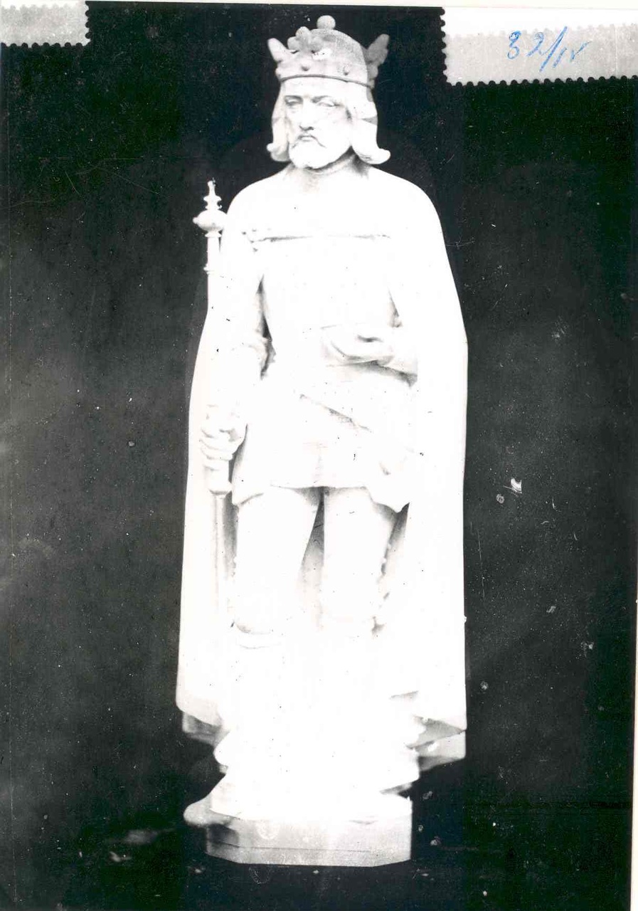 Op -16 staat een beeld van een koning met een staf in de ene en een kerk in de andere hand.